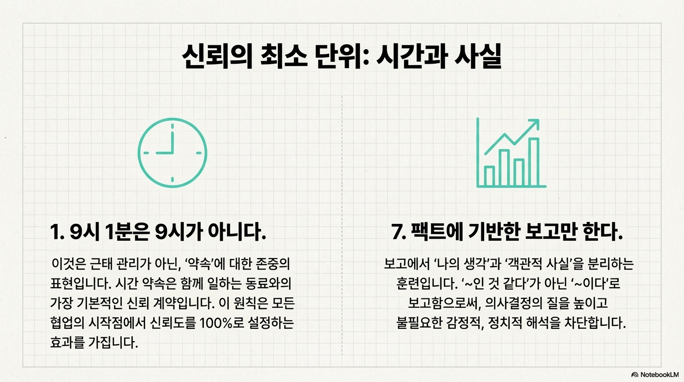 지각을 하지 말라는 말보다 → *“9시 1분은 9시가 아니다”*라는 기준이 더 강력하고, 잘 협업하라는 말보다 → *“간단한 보고는 상급자가 자리로 간다”*는 규칙이 더 효과적이며, 책임감을 가지라는 주문보다 → *“책임은 결정자가 진다”*는 구조가 행동을 바꿉니다.