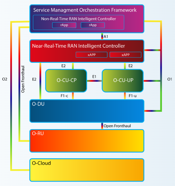 - WG8 (스택 참조 디자인 작업 그룹): 이 그룹의 목적은 O-RAN 및 3GPP 사양에 기반한 O-RAN 중앙 단위(O-CU) 및 O-RAN 분산 단위(O-DU)의 소프트웨어 아키텍처, 디자인 및 출시 계획을 개발하는 것입니다.