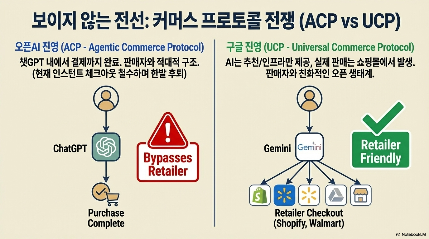 - 적대적 ACP vs 친화적 UCP: 오픈AI의 ACP는 구매가 챗GPT 내에서 완결되어 판매처를 소외시키는 구조였습니다. 반면 구글의 UCP(유니버셜 커머스 프로토콜)는 결제가 자사몰에서 이루어지게 돕는 인프라 중심이라 판매자들의 지지를 얻었습니다.