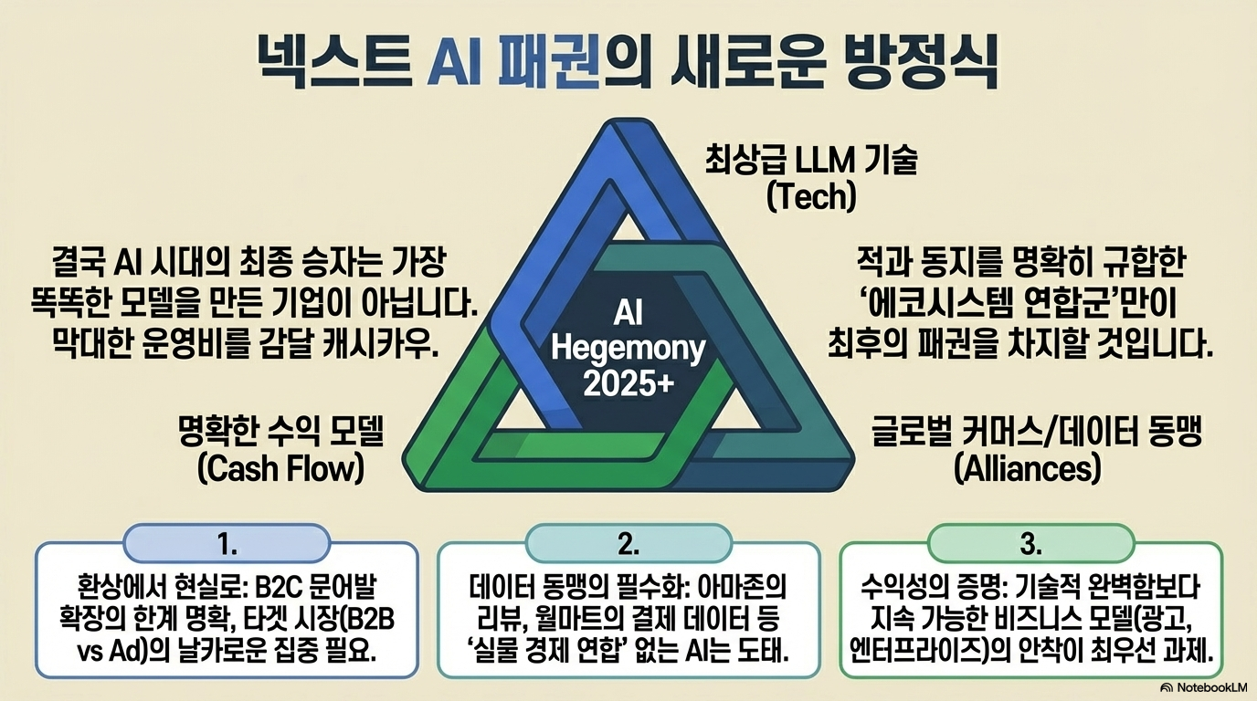 모든 분야를 찔러보던 오픈AI는 이제 '문어발'을 자르고 '광고'와 '연합'이라는 두 장의 카드에 올인했습니다. 과연 이들은 광고를 통해 지속 가능한 캐시카우를 확보하고, '단 하나의 확실한 성공'을 거머쥐어 AI 제국의 왕좌를 수호할 수 있을까요? 오픈AI의 생존을 건 도박의 결과는 멀지 않은 미래에 우리 앞에 나타날 것입니다.