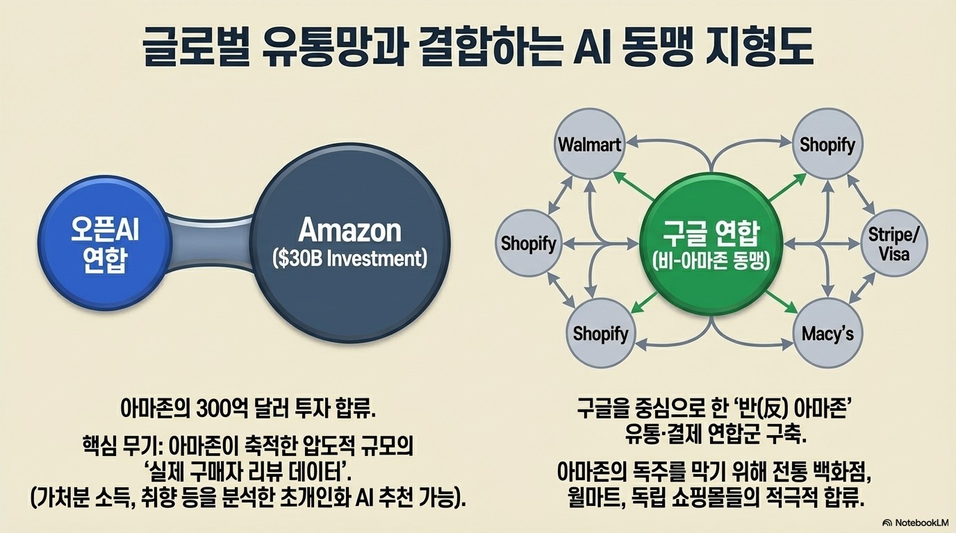 - 아마존의 300억 달러(약 40조 원) 투자: 오픈AI는 사실상 '주주'로 들어온 아마존에게 구매 기능을 넘기고 자신들은 '초개인화 추천'에 집중하기로 했습니다.