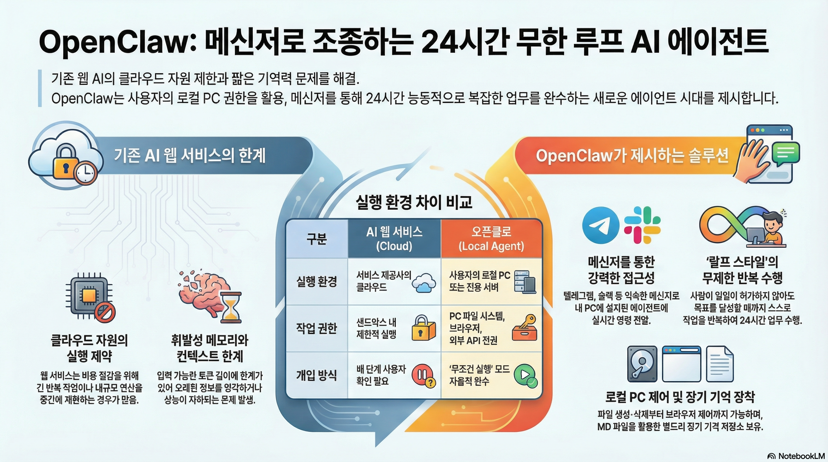 하지만 OpenClaw는 다릅니다. 이 AI 에이전트는 사용자의 로컬 PC 자원을 직접 활용하여 코드를 실행합니다. 이는 AI에게 내 컴퓨터라는 '신체'를 제공하는 것과 같습니다. Claude Code가 AI에게 처음으로 로컬 PC의 터미널 접근 권한을 줬다면, OpenClaw는 한 걸음 더 나아가 파일 관리, 웹 브라우징, 프로그램 설치 등 PC의 거의 모든 제어권을 체계적으로 오케스트레이션합니다.