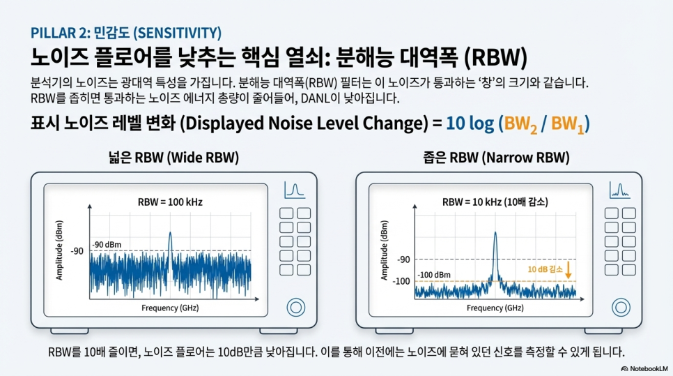 스펙트럼 분석기에는 분해능 대역폭(Resolution Bandwidth, RBW)이라는 중요한 설정값이 있습니다. 이는 일종의 '주파수 돋보기'와 같습니다. RBW 값을 좁게 설정할수록 돋보기의 배율이 높아져, 서로 매우 가깝게 붙어 있는 두 개의 주파수 신호를 명확하게 분리해서 볼 수 있습니다.