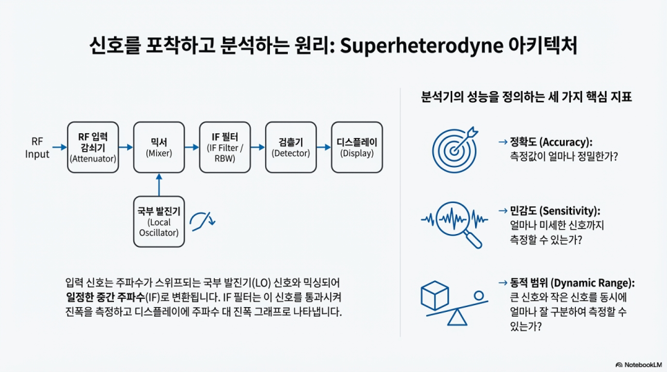 두 기기의 블록 다이어그램을 나란히 놓고 보면 로컬 오실레이터(LO), 믹서(Mixer), 중간 주파수(IF) 필터 등 핵심 부품들이 놀라울 정도로 유사합니다. 두 기기 모두 외부에서 들어온 높은 주파수의 신호를 믹서에서 내부의 LO 신호와 혼합하여, 다루기 쉬운 중간 주파수(IF)로 변환('헤테로다인')한 뒤 처리하는 원리를 사용합니다.