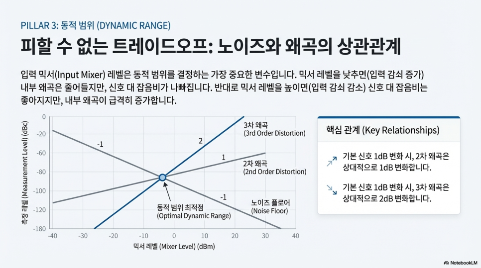 이로 인해 화면에 보이는 왜곡 신호가 원래 신호에 포함된 것인지, 아니면 분석기 내부에서 생성된 것인지 구분하기 어려운 문제가 발생합니다. 엔지니어들은 이 문제를 해결하기 위해 간단하면서도 기발한 '감쇠기 테스트(Attenuator Test)'를 사용합니다. 입력 감쇠기를 10dB 증가시키면, 내부 회로는 이를 보상하기 위해 자동으로 IF 게인을 10dB 높입니다. 이때 외부에서 들어온 실제 왜곡 신호는 디스플레이에서 동일한 레벨을 유지합니다. 하지만 믹서에 도달하는 전력에 따라 달라지는 내부 생성 왜곡 신호는 감쇠 증가로 인해 그 원천이 약해져 디스플레이에서 레벨이 현저히 떨어집니다. 이 간단한 조치 하나로 신호의 결함과 장비의 결함을 명확히 분리할 수 있습니다.
