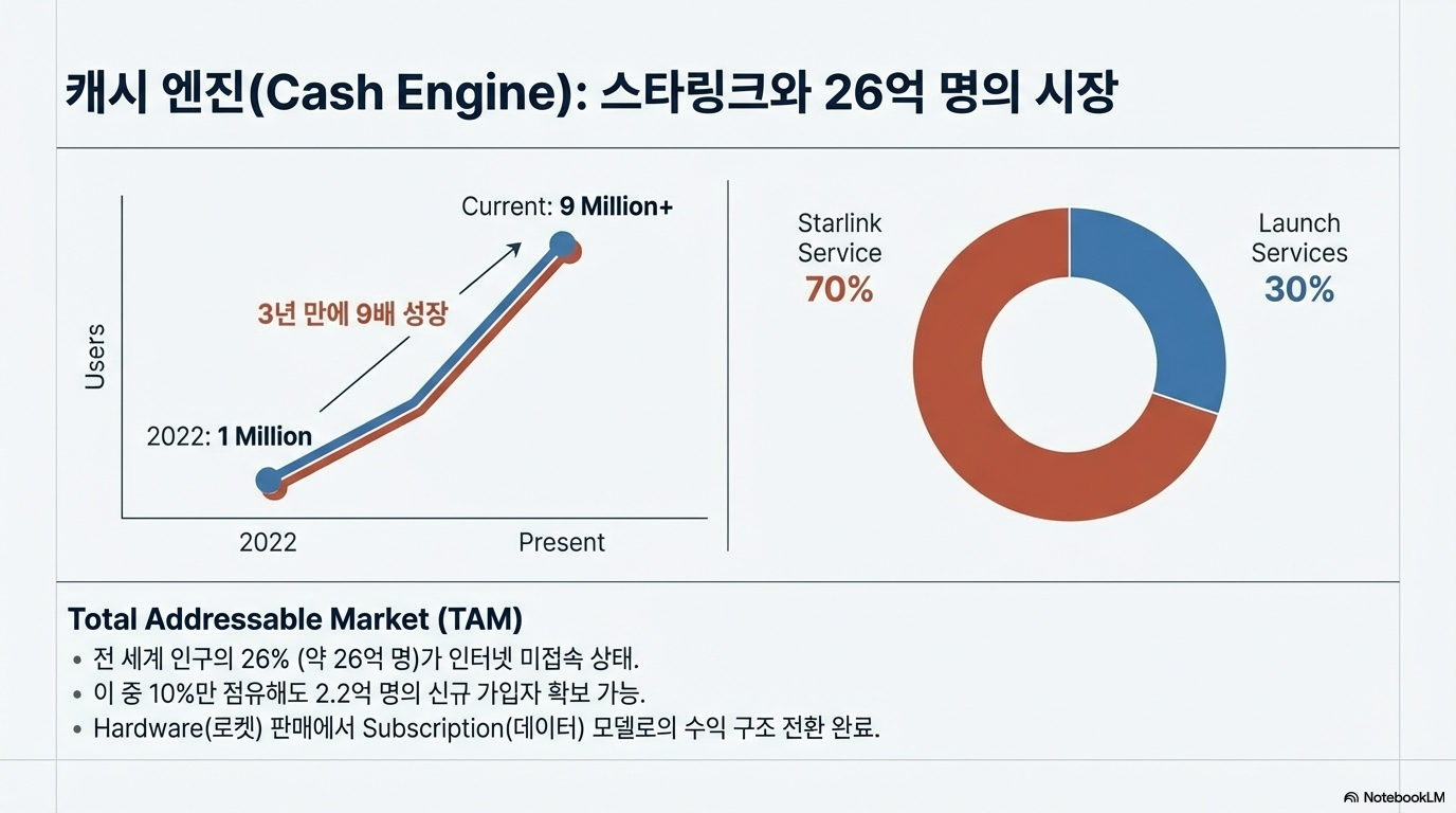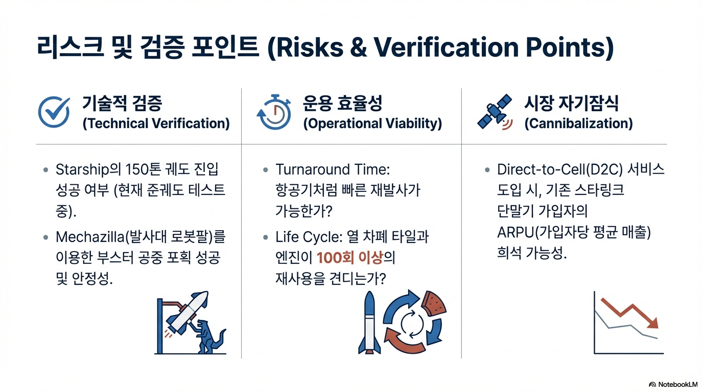 • 강력한 선순환: 스타링크의 서비스 매출은 다시 로켓 개발에 투자되고, 더 발전된 로켓은 더 많은 스타링크 위성을 쏘아 올려 더 큰 매출을 창출합니다.