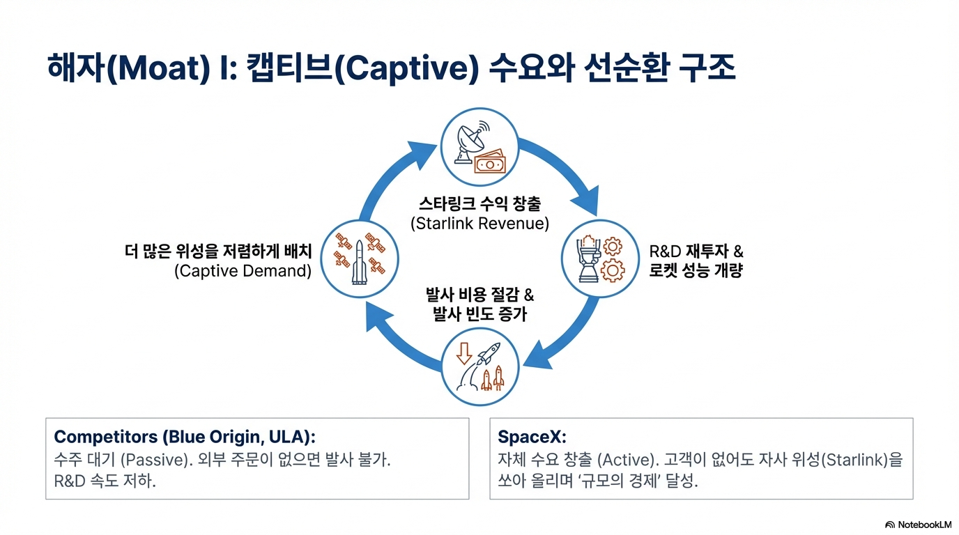 스페이스X의 가장 강력하면서도 간과하기 쉬운 경쟁 우위 중 하나는 바로 캡티브 수요(Captive Demand), 즉 '자체 수요'입니다.