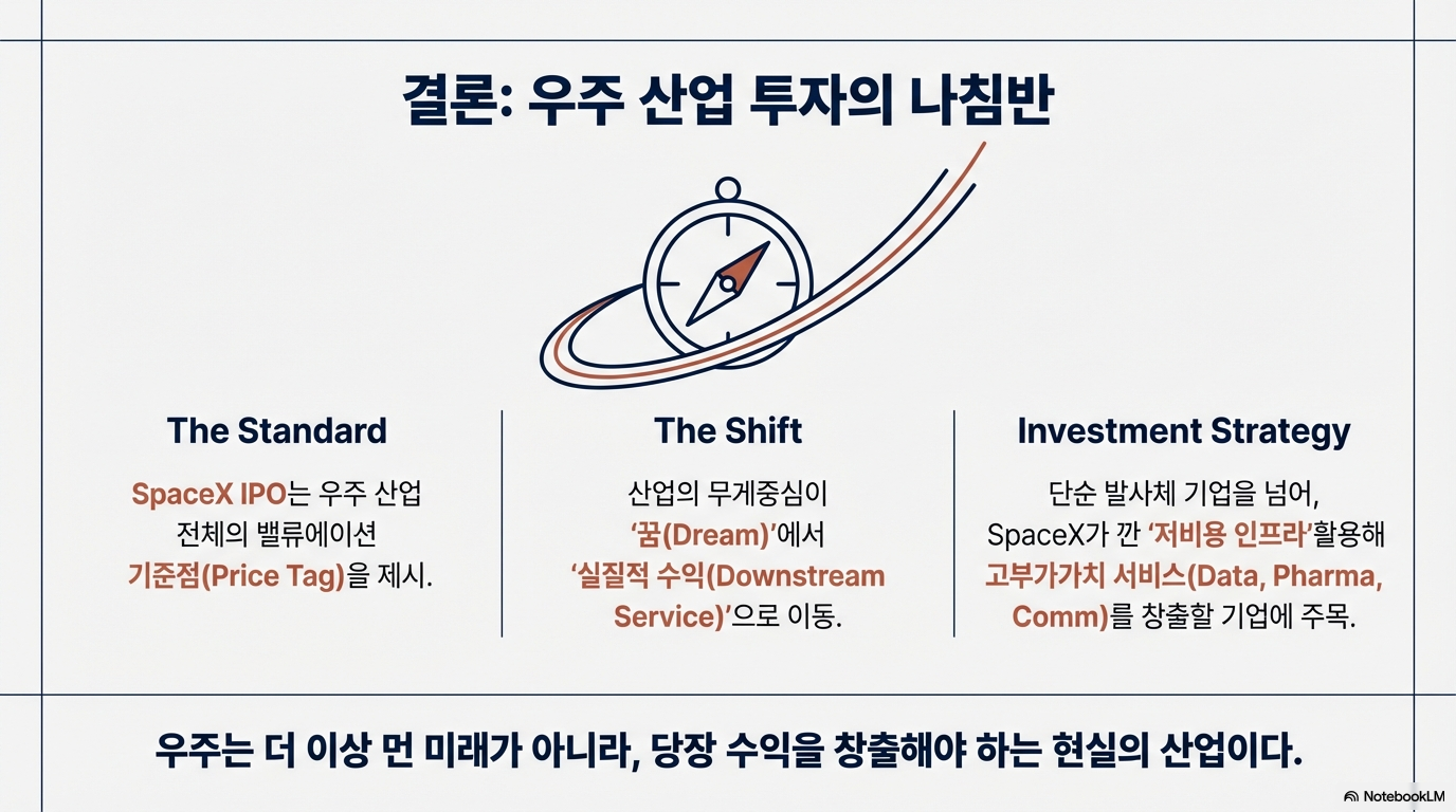 스페이스X의 상장은 단순한 하나의 기업 공개(IPO) 이벤트가 아닙니다. 이는 그동안 정부 주도의 프로젝트 영역에 머물러 있던 '우주'가 비로소 자본시장과 결합하여 진정한 '산업'으로 거듭나는 역사적인 순간을 의미합니다.