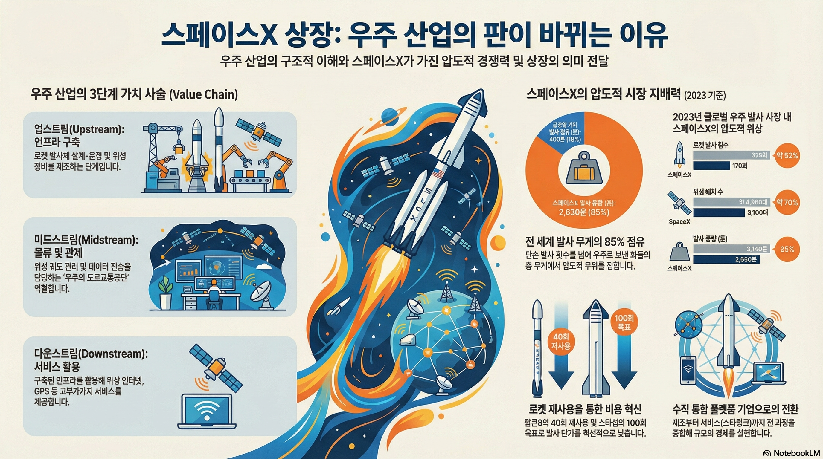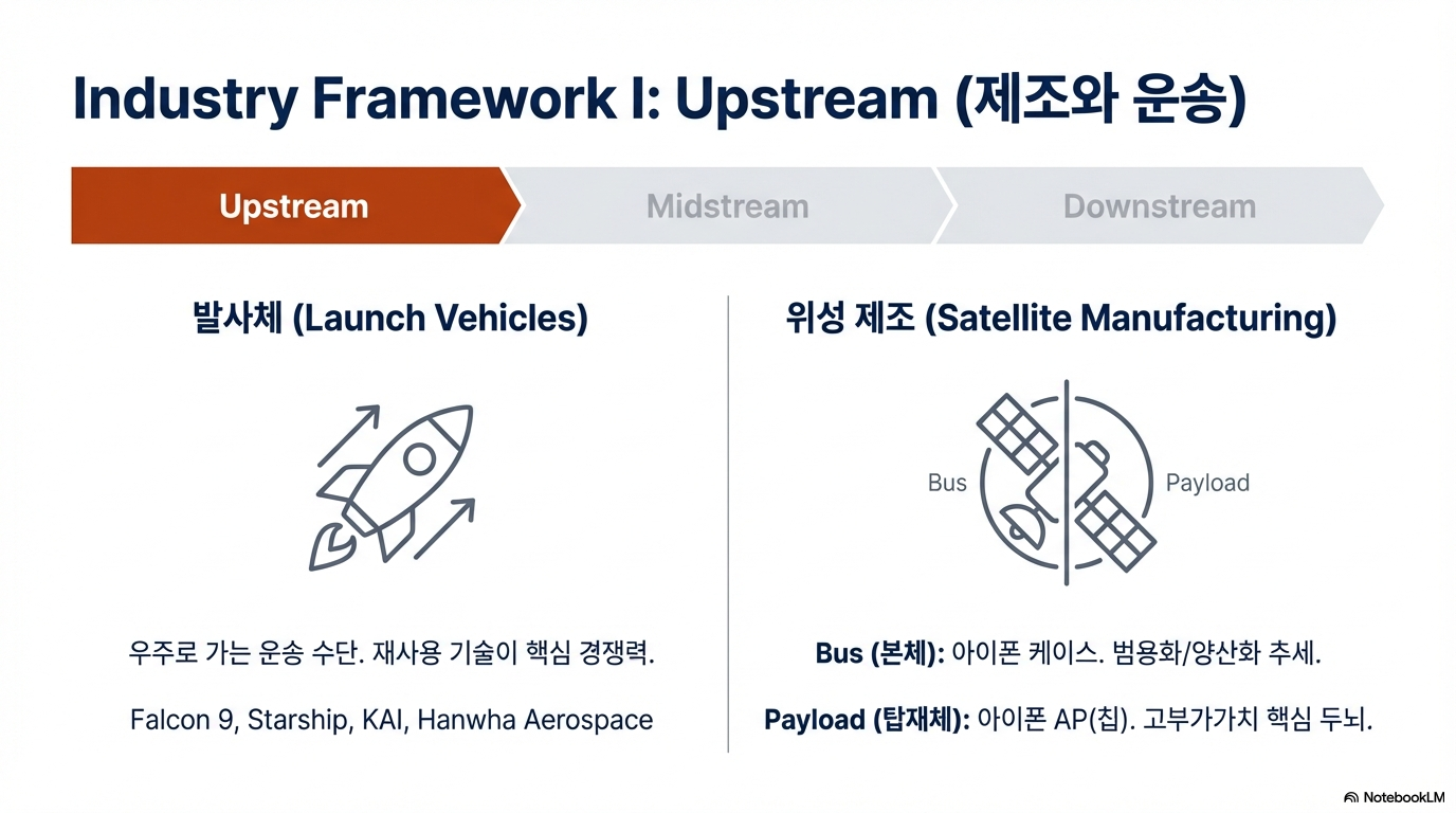 • 업스트림(Upstream): 로켓과 위성 등 우주 인프라를 구축하기 위한 장비를 '제조'하는 단계입니다. 우리가 뉴스 헤드라인에서 접하는 스페이스X의 모습이 바로 여기에 해당합니다.