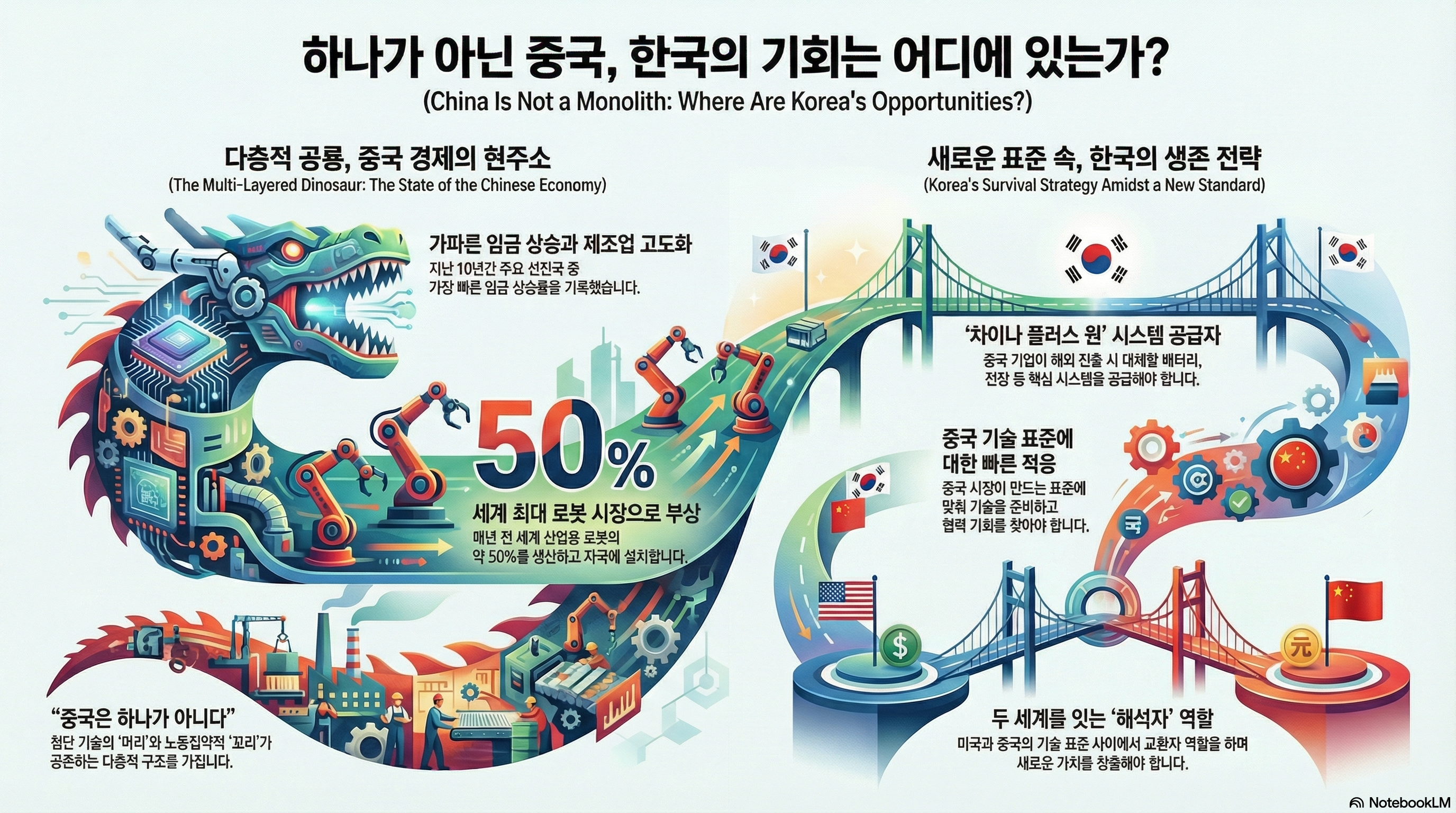 지금까지 우리는 중국에 대한 네 가지 오해를 통해 파편적인 시각을 넘어선, 더 입체적인 이해에 도달했습니다. 가파른 인건비 상승과 '지방 호족'처럼 움직이는 분권화된 경제 구조는 중국으로 하여금 미래 경쟁력을 위해 고도의 자동화를 선택하게 만들었습니다. 그리고 이 과정에서 만들어진 새로운 기술 표준은 역설적으로 한국에게 '시스템의 플러스 원'이라는 전략적 기회를 제공합니다.