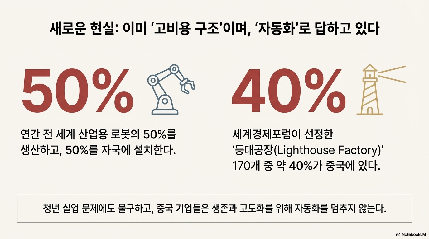 최근 중국의 높은 청년 실업률이 주요 뉴스로 다뤄지고 있습니다. 이런 상황에서 중국이 전 세계 산업용 로봇의 약 50%를 자국에 설치하며 공장 자동화에 박차를 가하는 것은 언뜻 모순처럼 보입니다. 하지만 앞서 살펴본 중국의 복잡한 현실을 이해하면, 이는 필연적인 전략적 선택임을 알 수 있습니다.