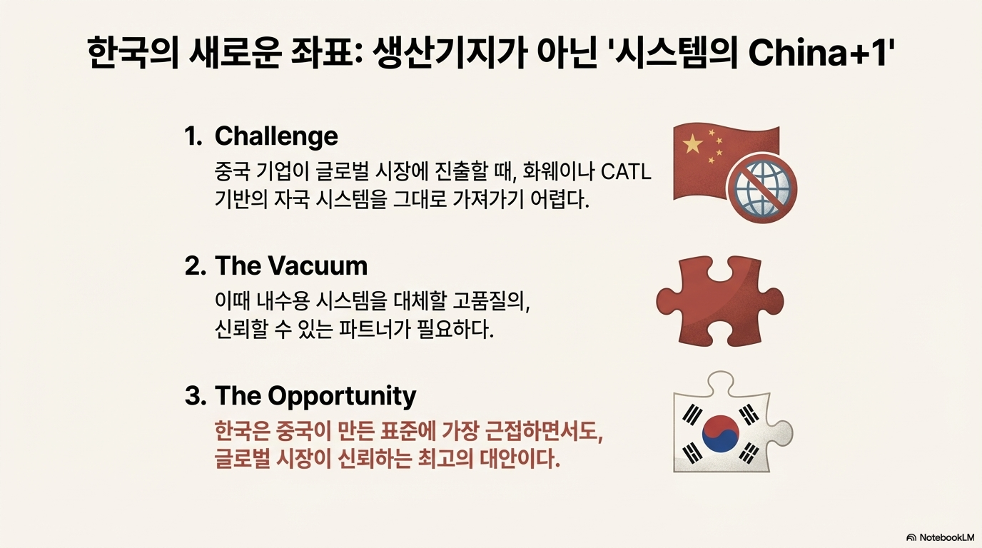 중국 기업이 해외 시장에 맞게 시스템을 재구성할 때, 한국의 뛰어난 기술이 그 빈자리를 채우는 '시스템의 플러스 원'이 될 수 있다는 전략입니다. 여기서 '시스템'이란 구체적으로 **AI, 배터리, BMS(배터리 관리 시스템), 전장(자동차 전자 장비)**과 같은 핵심 부품 및 기술을 의미합니다. 중국이 만든 표준에 맞춰 우리가 이 요소들을 공급할 수 있다면, 우리는 단순한 경쟁자가 아닌 필수적인 협력 파트너가 될 수 있습니다.