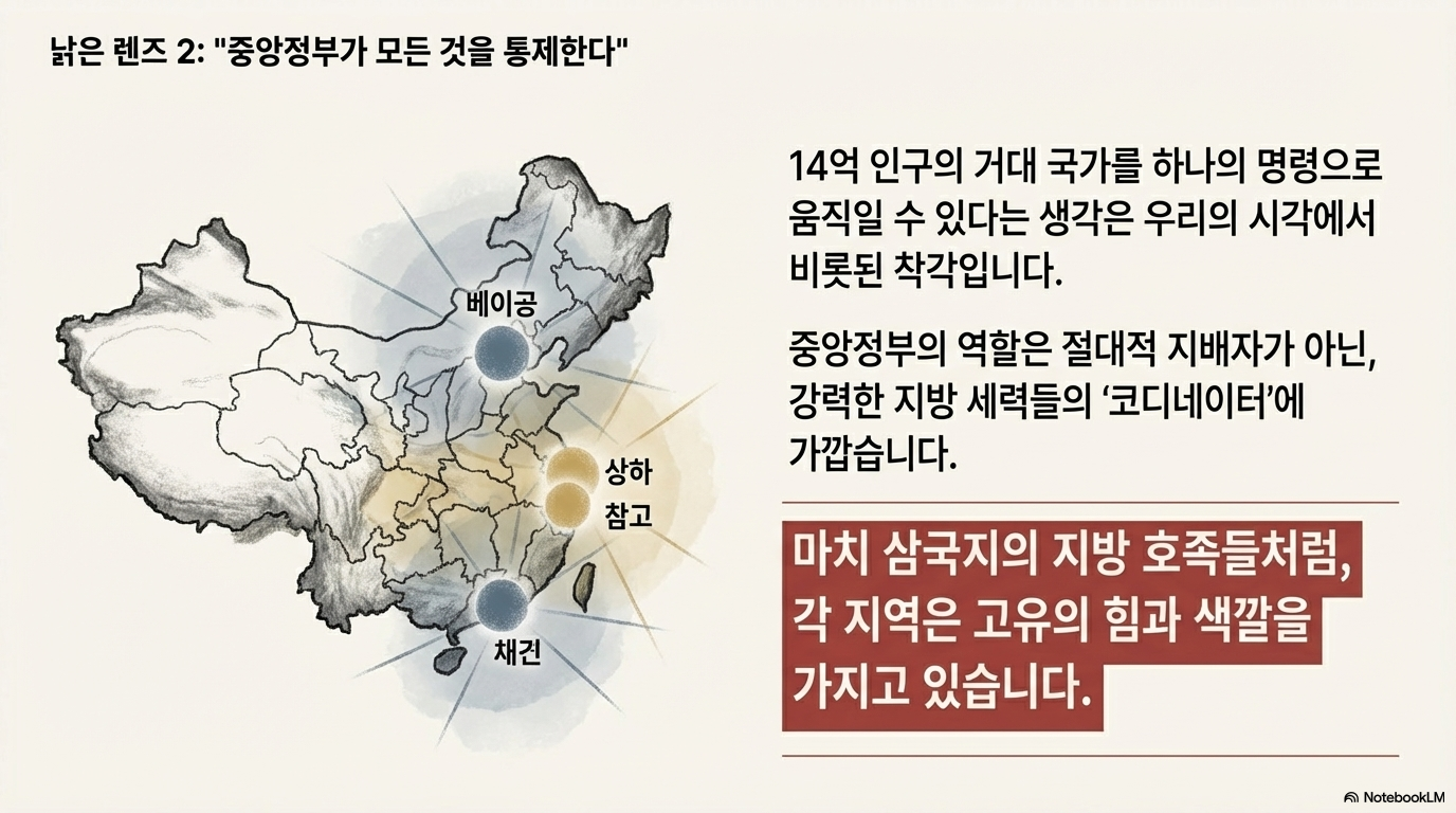 이처럼 중국은 첨단 기술과 전통적 수공업이 공존하는 복합체입니다. 따라서 중앙정부의 역할은 강력한 '통제(Control)'라기보다는, 이 거대한 공룡의 여러 부위가 조화롭게 움직이도록 이끄는 '조정(Coordination)'에 가깝습니다. 바로 이 복잡성 때문에 우리는 세 번째 오해에 빠지게 됩니다.