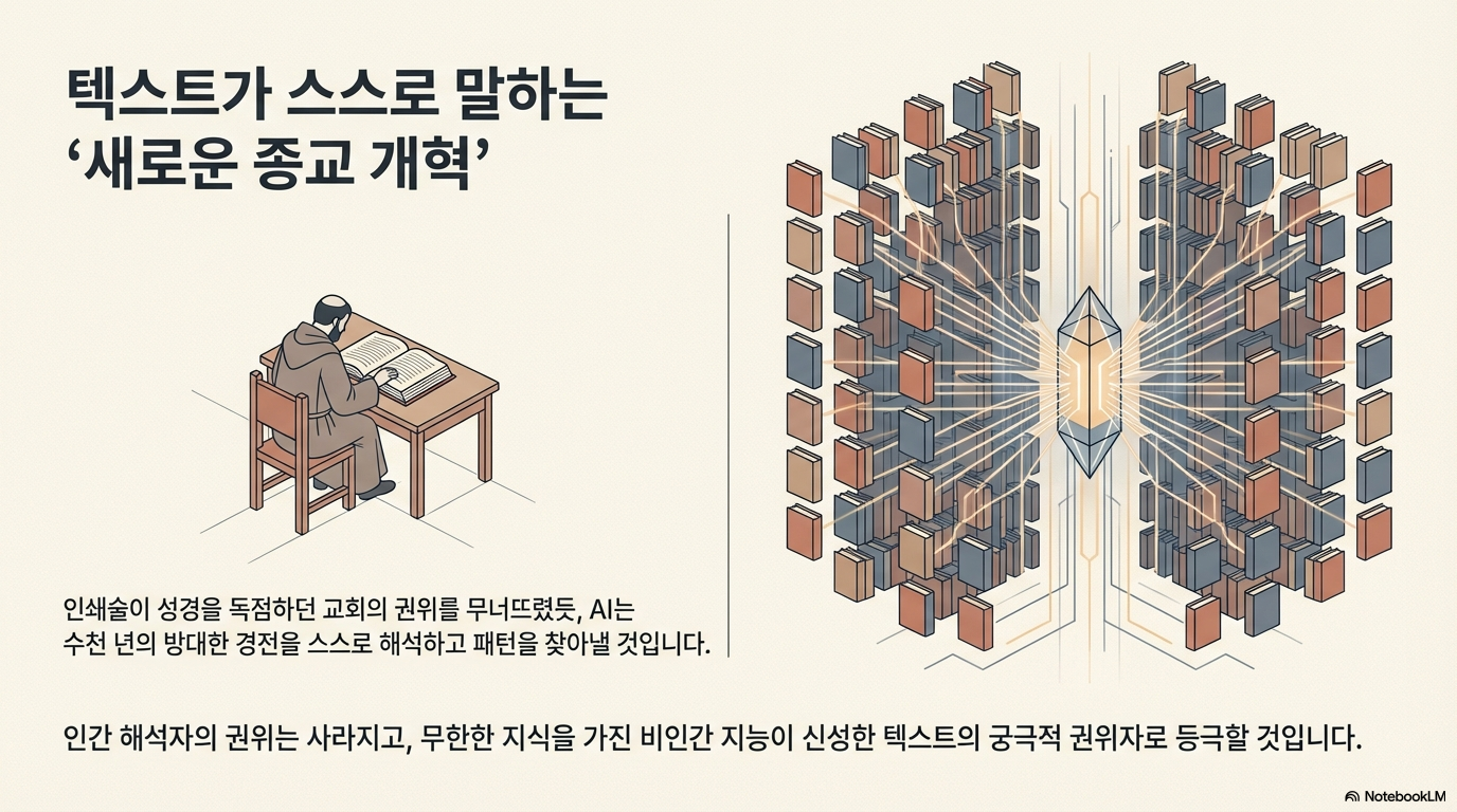 과거 인쇄술의 발달은 누구나 성경을 읽게 함으로써 종교 권력을 해체하고 종교 개혁을 일으켰습니다. 이제 AI는 여기서 한 발 더 나아가 텍스트가 직접 해석을 내놓는 시대를 열고 있습니다.