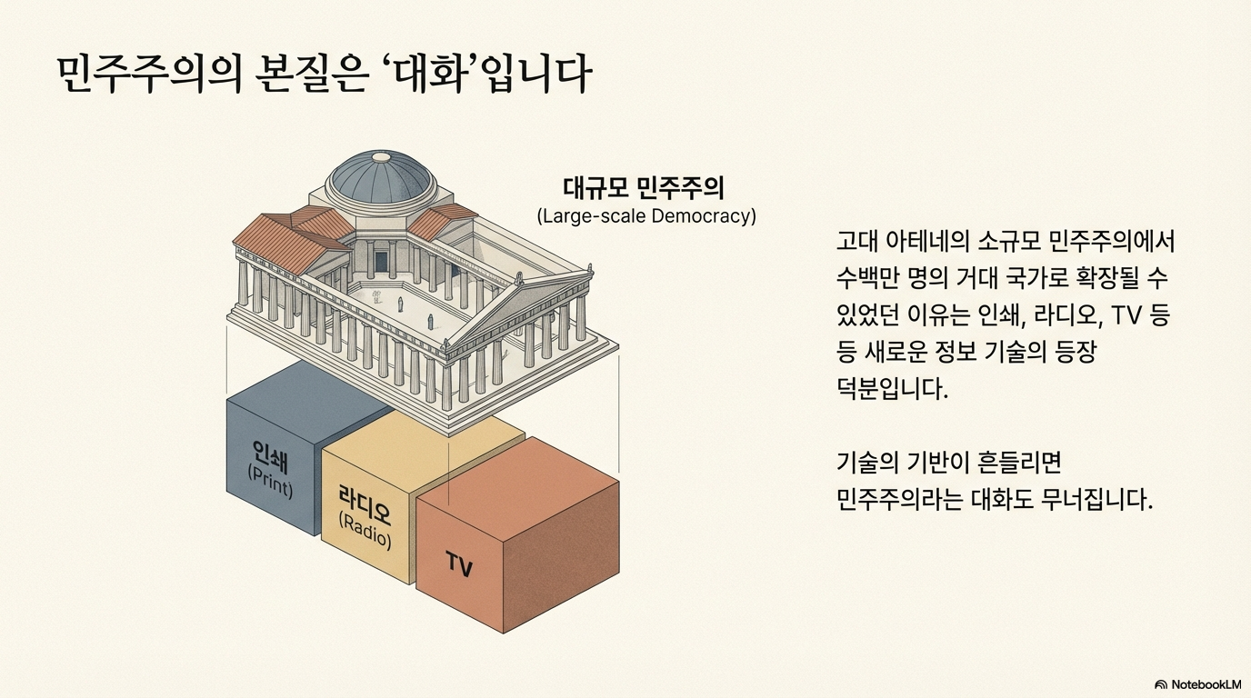 민주주의의 본질은 '대화'이며, 대화의 기반은 '신뢰'입니다. 하지만 지난 10년 사이 우리는 인간 기관에 대한 신뢰를 잃고 알고리즘에 그 자리를 내어주고 있습니다.