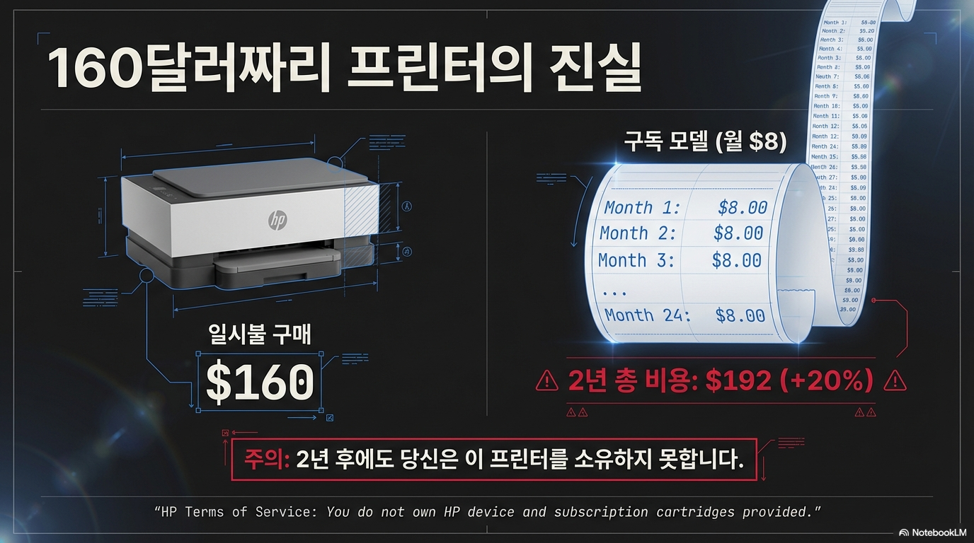 기업들은 구독이 초기 비용을 낮춰주는 합리적인 선택이라고 유혹하지만, 실상을 들여다보면 이는 교묘하게 설계된 경제적 함정입니다. 160달러짜리 HP 프린터를 예로 들어보겠습니다. 월 8달러의 구독 서비스를 이용할 경우, 단 2년 만에 소비자는 제품 가격보다 20% 더 많은 192달러를 지불하게 됩니다. 여기에 HP는 월 출력 페이지 수를 제한하고 초과 시 추가 요금을 부과하는 방식으로 더 많은 수익을 쥐어짜냅니다.