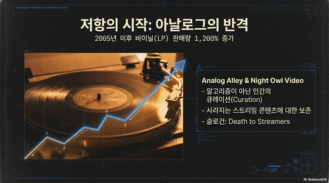이러한 숨 막히는 디지털 통제에 반기를 든 사람들은 다시 '물리적 실체'로 눈을 돌리고 있습니다. 2005년 이후 무려 1,200% 성장한 바이닐(LP) 시장이 그 증거입니다. 브루클린의 '아날로그 앨리(Analog Alley)'에 위치한 비디오 대여점 '나이트 올 비디오(Night Owl Videos)'는 "스트리머에게 죽음을(Death to streamers)"이라는 과격하지만 명쾌한 슬로건을 내걸었습니다.