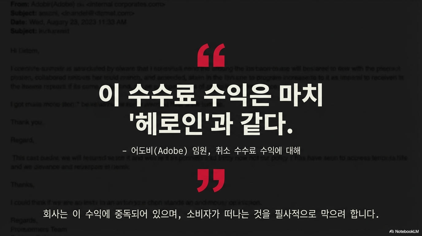 "위약금 수익이 회사의 실적에 너무나 중요했기에, 어도비의 한 임원은 회사가 이 수수료에 얼마나 중독되어 있는지를 '헤로인(heroine)'에 비유하기도 했습니다." - FTC 소송 배경 중