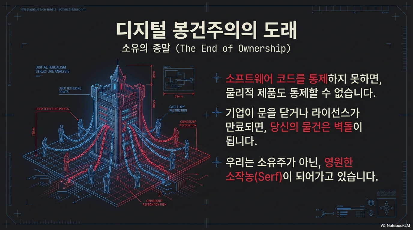 전문가들은 이러한 '소유의 종말'이 사회를 **'디지털 봉건주의(Digital Feudalism)'**로 되돌리고 있다고 경고합니다. 과거 영주가 땅을 독점하고 농노에게 사용권을 빌려주며 통제했듯, 이제 거대 테크 기업들이 소프트웨어라는 보이지 않는 사슬로 우리가 산 물건을 통제한다는 논리입니다.
