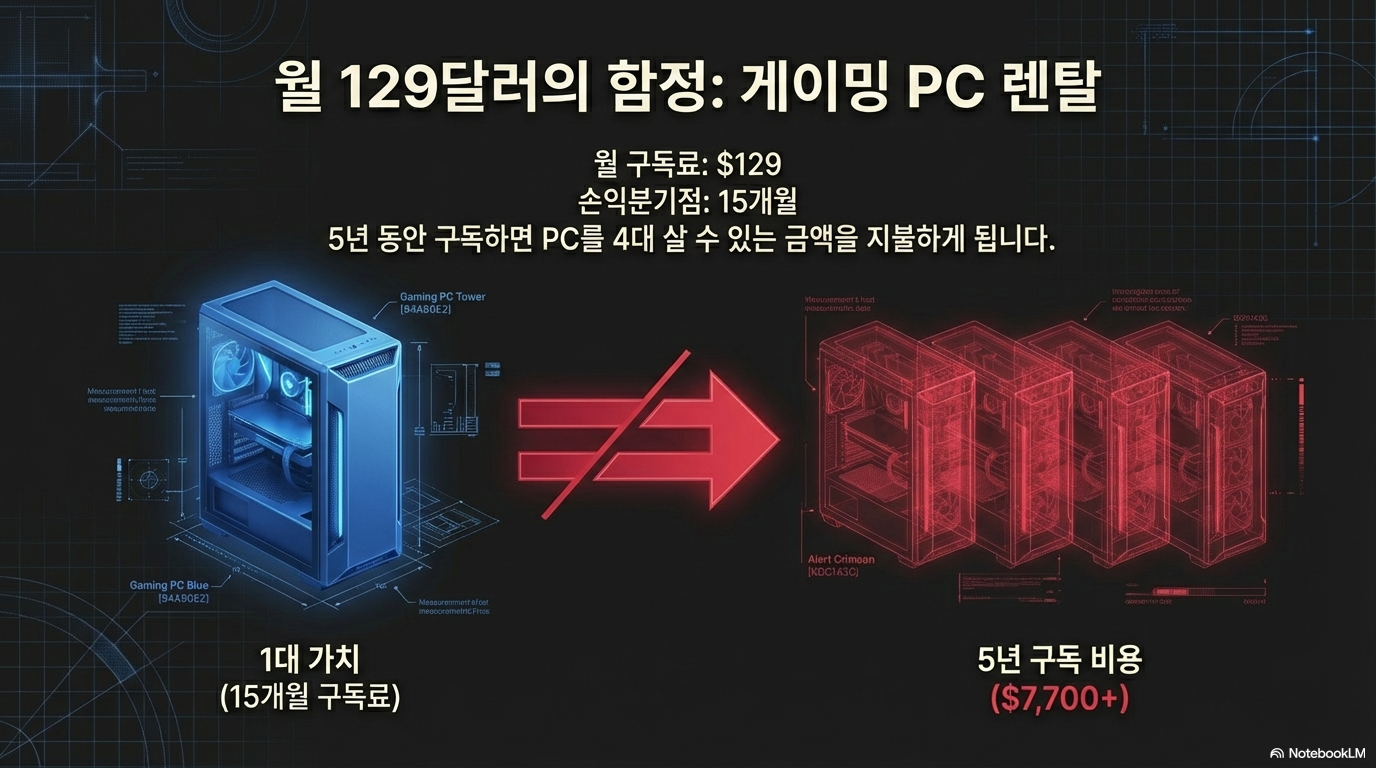 더 심각한 사례는 게이밍 PC 구독 서비스인 NZXT입니다. 월 129달러를 내고 중급 PC를 빌려 쓰면, 단 15개월 만에 컴퓨터 본체 가격을 추월합니다. PC의 평균 수명인 5년을 기준으로 계산하면 총 지불액은 무려 7,700달러에 달하는데, 이는 동일한 사양의 PC를 4대나 구매할 수 있는 금액입니다. '편리한 접근'의 대가가 실제로는 기업의 폭리로 이어지고 있는 것입니다.