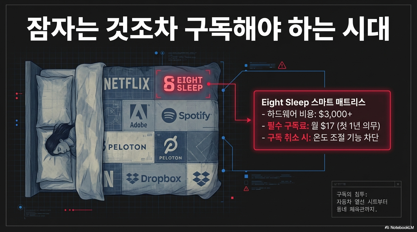예를 들어, '에이트 슬립(Eight Sleep)'의 스마트 매트리스 커버는 제품 가격만 3,000달러에 달하지만, 핵심 기능을 사용하려면 매달 17달러의 구독료를 별도로 지불해야 합니다. 400만 원에 가까운 거금을 들여 물건을 사고도 매달 '수면료'를 내지 않으면 제 기능을 못 하는 기묘한 현실. 우리는 과거보다 편리한 세상에 살고 있는 듯 보이지만, 실상은 "왜 예전보다 더 많은 돈을 쓰면서도 정작 내 손에 온전히 쥐어지는 것은 없는가?"라는 근본적인 질문에 직면해 있습니다. 편리함이라는 미명 아래, 우리는 소유권이라는 이름의 자유를 조금씩 박탈당하고 있습니다.