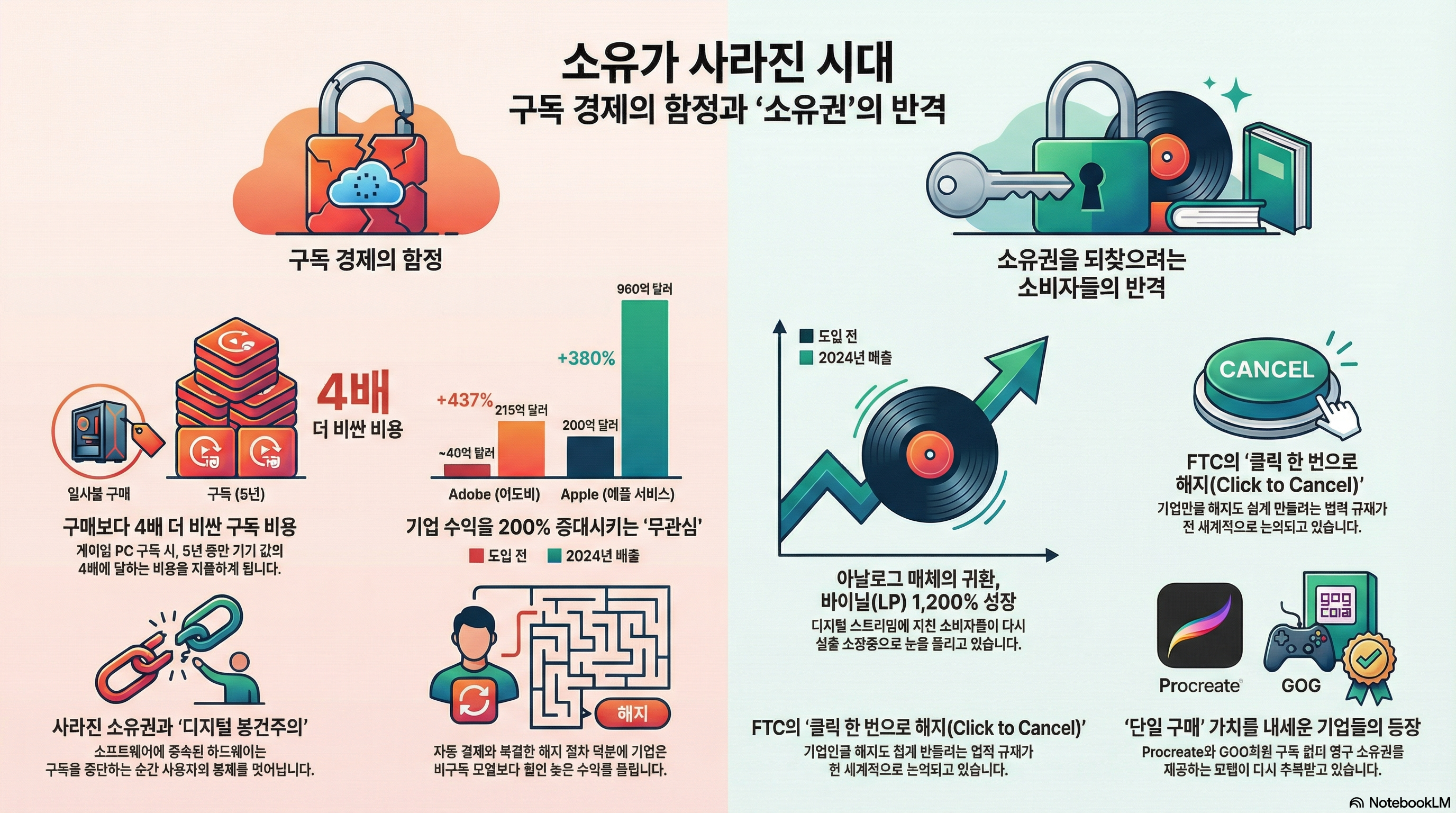 구독 경제는 기업에게는 매달 꼬박꼬박 들어오는 '끈적한 수익'을 약속하지만, 소비자에게는 끊임없는 지출과 통제권의 상실이라는 속박을 안겨줍니다. 우리가 누리는 편리함의 이면에 '소유권의 박탈'이라는 비싼 대가가 숨어 있음을 잊지 말아야 합니다.