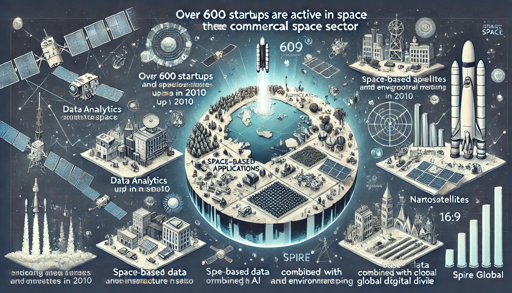 우주 분야에서는 600개 이상의 스타트업이 운영 중이며, 이는 2010년의 250개보다 크게 증가한 수치입니다. 우주 인프라 구축을 위한 투자 및 규제 준수의 필요성 등 높은 장벽에도 불구하고, 데이터 분석 및 서비스 제공을 통해 우주 기반 데이터의 가치를 활용하는 신생 기업들이 계속해서 등장하고 있습니다. 예를 들어, **스파이어 글로벌(Spire Global)**은 해양 산업을 위해 나노위성을 사용하여 선박 위치를 추적할 수 있도록 하는 서비스를 제공하고 있습니다.
