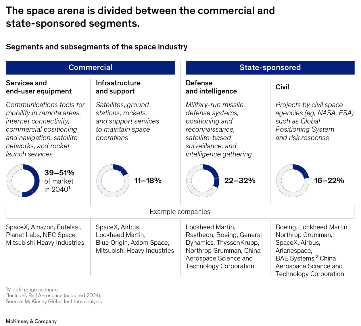 상업 부문은 크게 서비스 및 엔드 유저 장비, 그리고 인프라 및 지원 부문으로 나뉩니다. 2023년 상업 부문 매출은 1800억 달러에 달하며, 2040년에는 4200억에서 6900억 달러에 이를 것으로 보입니다. 특히, 위성 통신은 상업 부문 매출의 큰 부분을 차지할 것으로 예상되며, 스페이스X의 스타링크와 아마존의 프로젝트 쿠이퍼 같은 대형 위성군이 원격 지역의 연결성 수요를 충족시키면서 상업적 매출의 핵심 원천으로 자리 잡을 전망입니다.