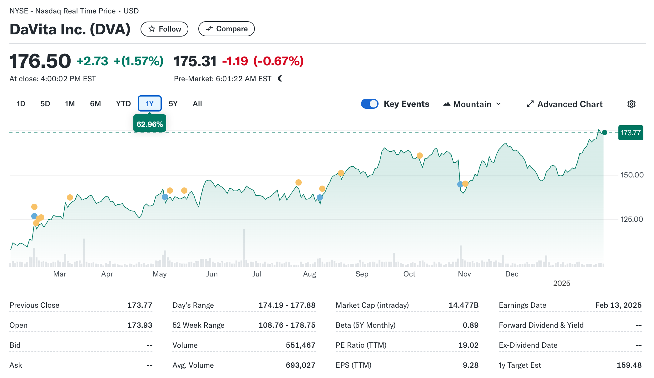 - 다비타(DVA)는 신장 투석 서비스라는 필수 의료 서비스를 제공하며, 경제 상황과 관계없이 꾸준한 수요를 유지합니다.