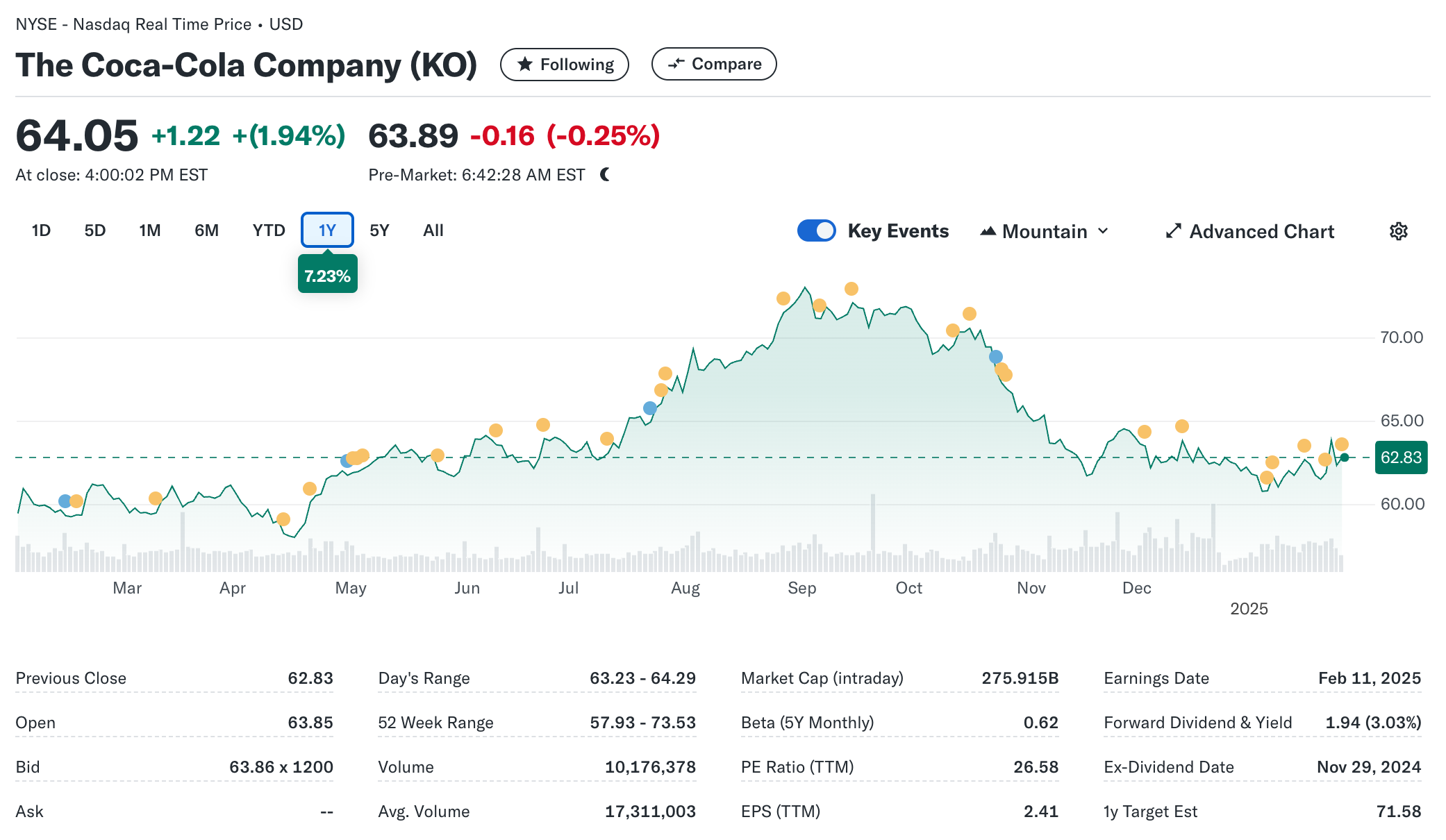 코카콜라(Coca-Cola, NYSE: KO)는 세계에서 가장 유명한 음료 브랜드로, 탄산음료 및 다양한 무알콜 음료 시장에서 절대적인 지위를 차지하고 있습니다.