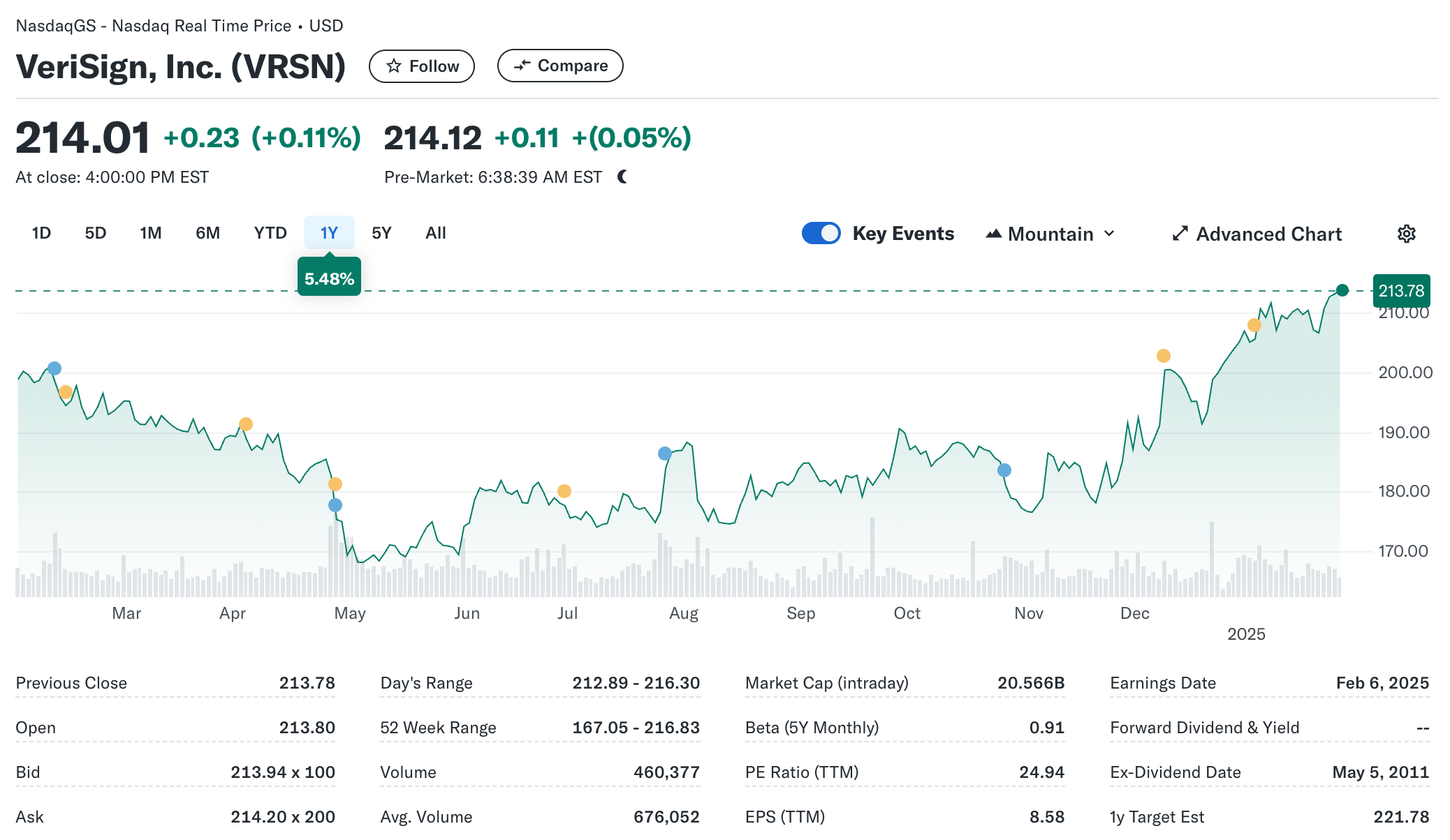 베리사인(VeriSign, NASDAQ: VRSN)은 .com과 .net 도메인 등록 및 관리 서비스를 제공하는 글로벌 네트워크 인프라 기업입니다. 전 세계 인터넷 도메인 등록의 상당 부분을 관리하며, 도메인 네임 시스템(DNS) 운영에서도 중요한 역할을 하고 있습니다.