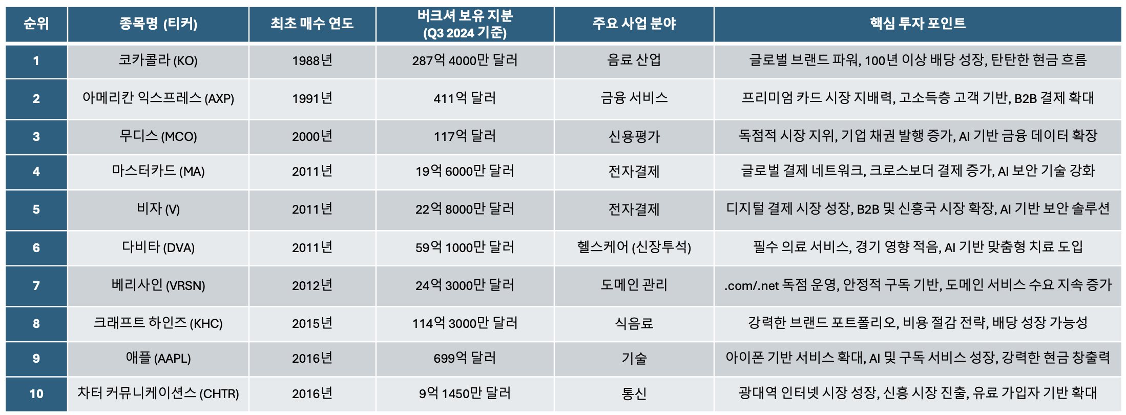 이제, 버핏이 가장 오랫동안 보유한 10개의 주식을 살펴보며, 왜 그가 이 종목들을 장기 보유하고 있는지 분석해보겠습니다.
