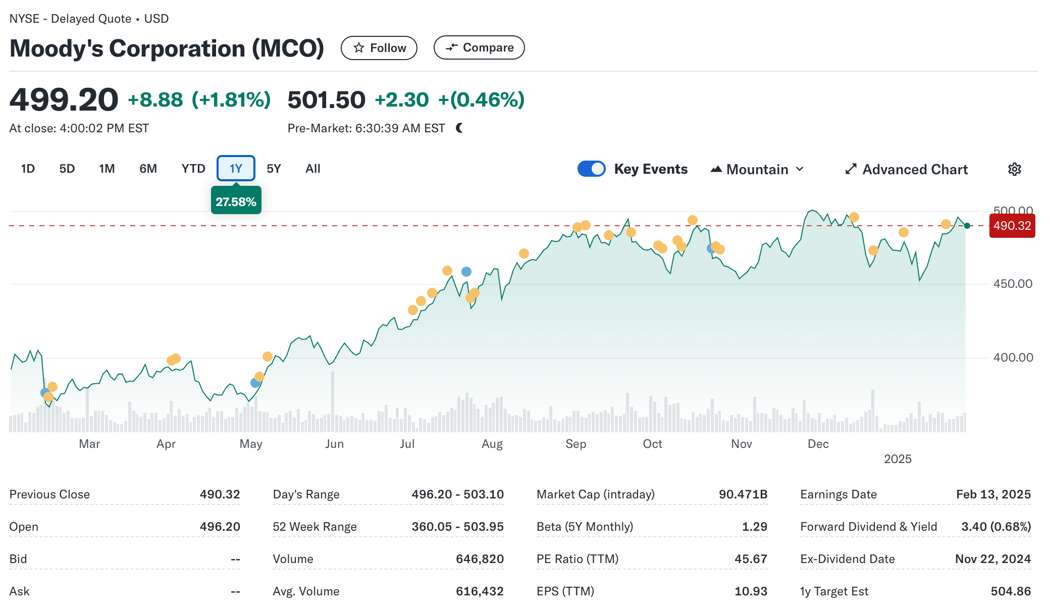 무디스는 세계 금융 시스템에서 필수적인 역할을 하는 기업으로, 경기 변동과 상관없이 꾸준한 수익을 창출할 수 있는 강력한 비즈니스 모델을 보유하고 있습니다. 워렌 버핏이 24년 이상 보유한 이유는 이 같은 독점적 시장 지위와 장기적인 성장 가능성 때문입니다.
