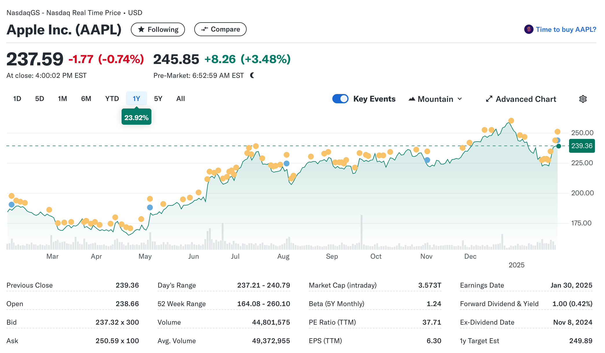 애플(NASDAQ: AAPL)은 전 세계에서 가장 가치 있는 기술 기업 중 하나로, 아이폰, 맥북, 애플워치, 아이패드, 그리고 다양한 서비스(애플 뮤직, 아이클라우드, 애플TV+)를 제공하고 있습니다.