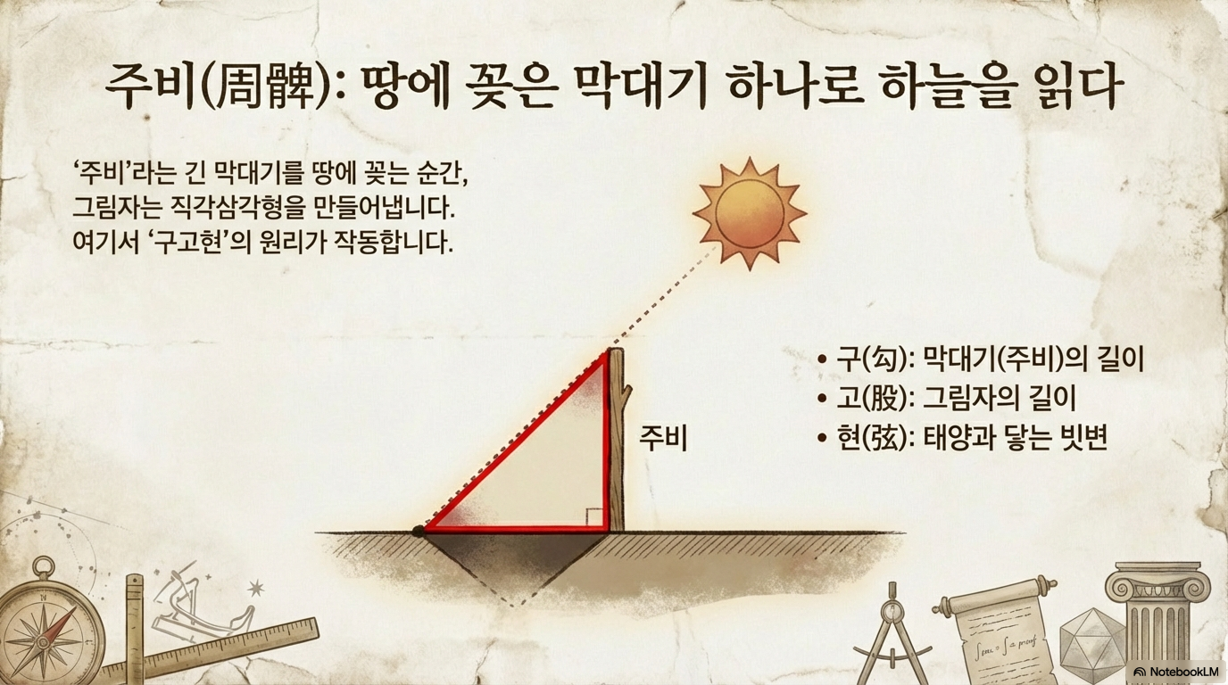 고대 동양 수학의 정점에는 ‘구고현 정리’가 있습니다. 밑변(구) 3, 높이(고) 4, 빗변(현) 5의 비율을 활용한 이 원리는 현대의 피타고라스 정리와 궤를 같이하며 동양 수학의 기초를 세웠습니다. 고대 중국인들은 ‘주비(막대기)’ 하나를 땅에 꽂아 직각삼각형을 만드는 것만으로 거대한 우주의 크기를 가늠하기 시작했습니다.