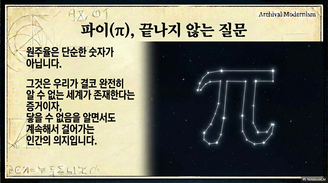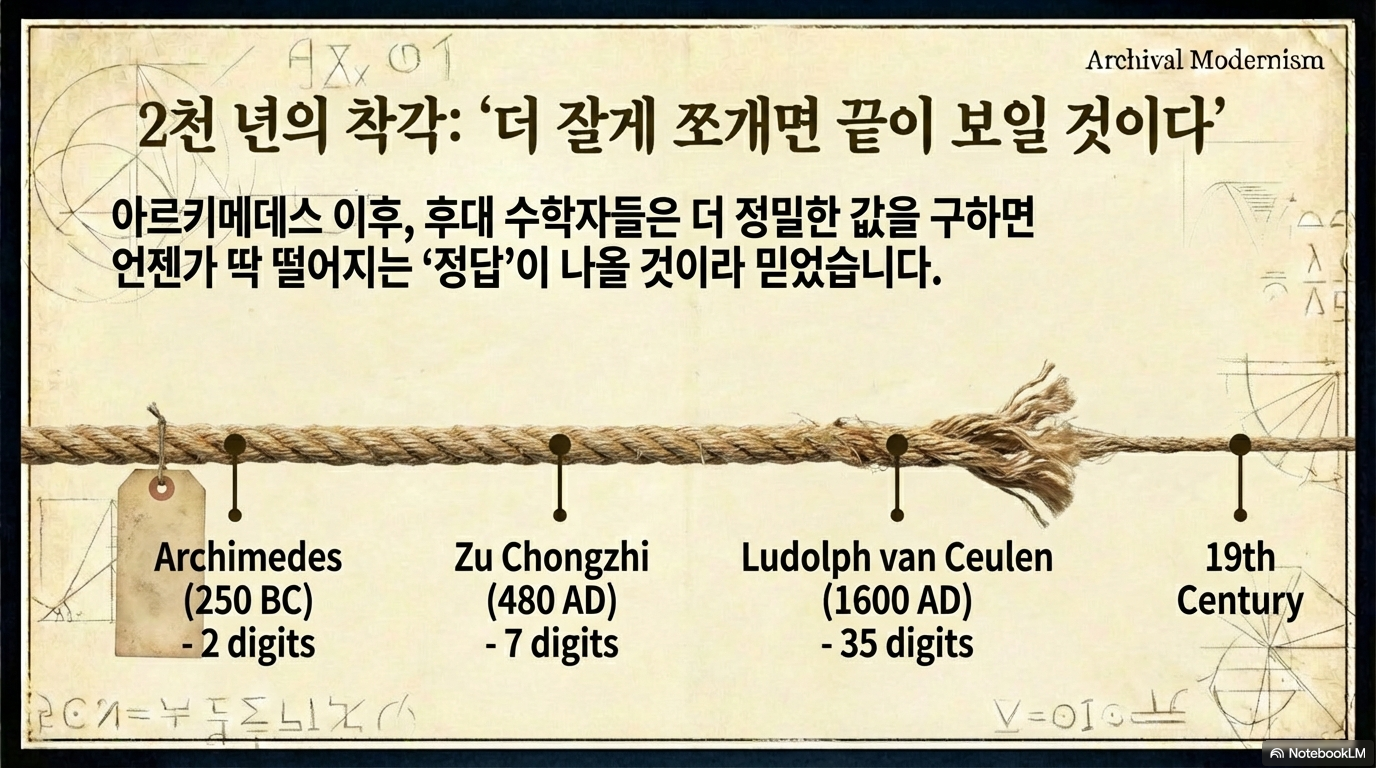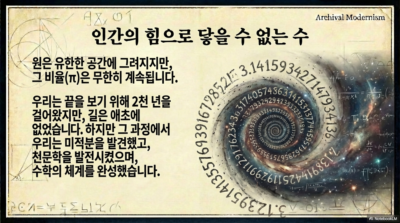 하지만 이 2,000년의 실패를 우리는 무엇이라 불러야 할까요? 고대의 수학자들은 길이 없는 줄 알면서도, 혹은 그 끝이 낭떠러지인 줄 모르면서도 끊임없이 원을 향해 걸어갔습니다. 그들의 발걸음은 비록 목적지에 닿지는 못했으나, 그 과정에서 인류 지성의 지평을 무한히 확장시켰습니다.