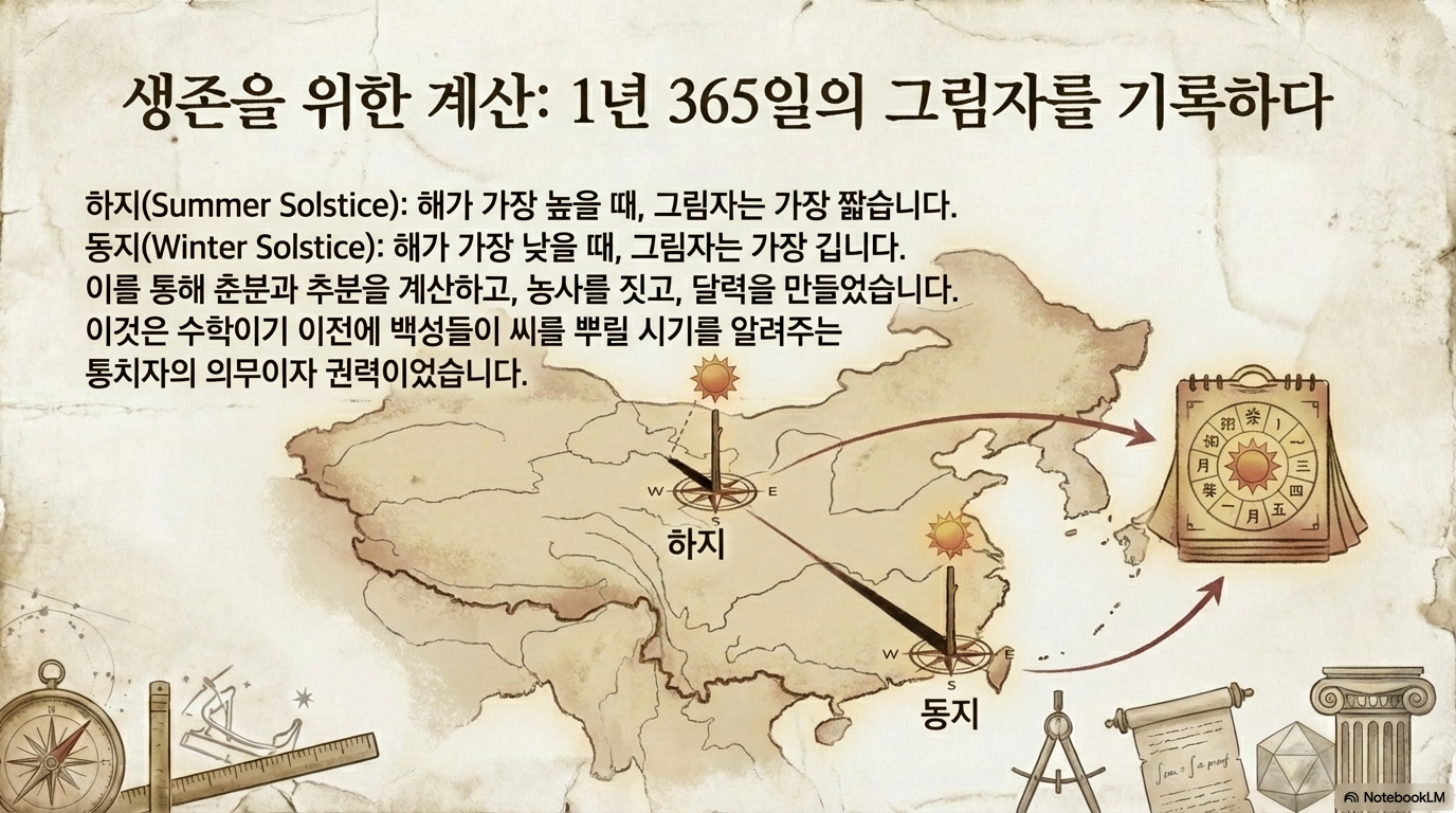 이처럼 동양은 ‘정사각형(주비)’이라는 도구를 통해 ‘원(하늘)’의 움직임을 관찰하고, 그 이치를 땅에 안착시켜 백성들의 삶을 규율했습니다.