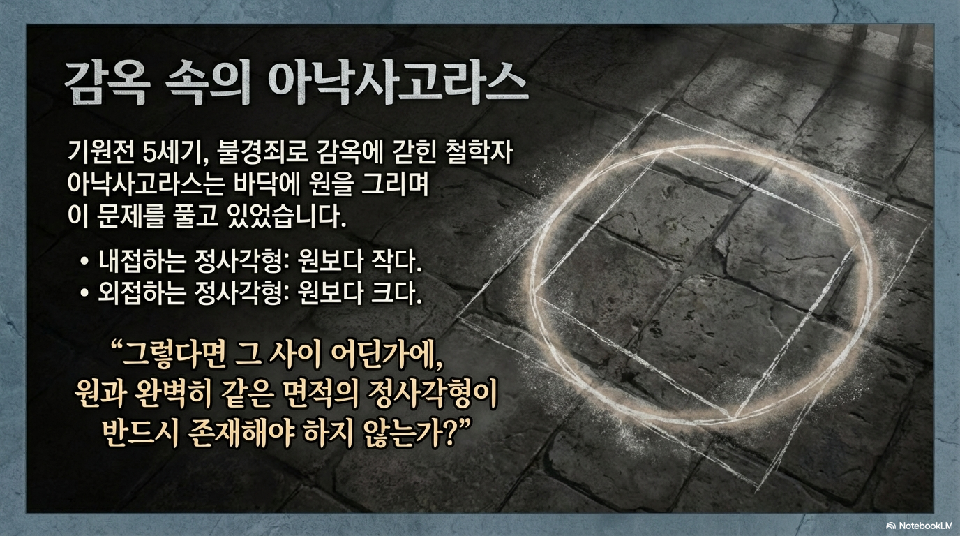 이 시기 수학자 아낙사고라스는 불경죄로 감옥에 갇힌 처절한 상황에서도 '원적 문제'에 매달렸습니다. 그의 육체는 돌벽에 갇혔고 그의 정신은 자와 컴퍼스라는 규칙에 갇혔지만, 그는 원과 면적이 동일한 정사각형을 작도하는 데 몰두했습니다. 이는 곡선의 세계를 직선의 세계로 편입시키려는 인간 지성의 야심 찬 도전이었으며, 동양이 사각형으로 원을 '관찰'했다면 서양은 원을 사각형으로 '치환'하려 했던 셈입니다.