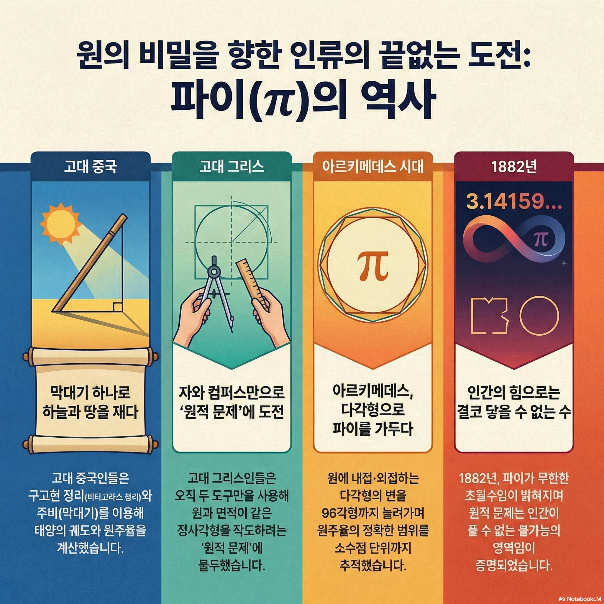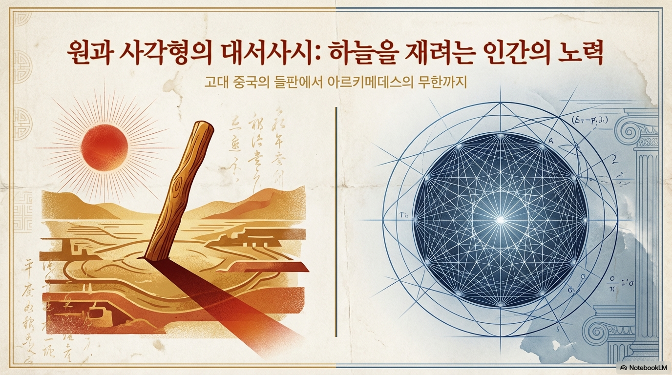 인류는 아주 오래전부터 ‘천원지방(天圓地方)’, 즉 하늘은 둥글고 땅은 네모나다는 믿음 속에 살았습니다. 이 소박한 믿음은 수학 역사상 가장 거대하고도 처절한 질문을 낳았습니다. 바로 ‘완벽한 곡선(원)을 어떻게 하면 인간의 논리인 직선(정사각형)으로 이해할 수 있는가’라는 문제였습니다. 고대인들에게 원의 넓이를 구하거나 파이(π)의 값을 계산하는 것은 단순한 산술적 유희가 아니었습니다. 그것은 불규칙해 보이는 우주의 질서를 파악하고, 신의 섭리를 인간의 언어로 번역하려는 필사적인 노력이었습니다.