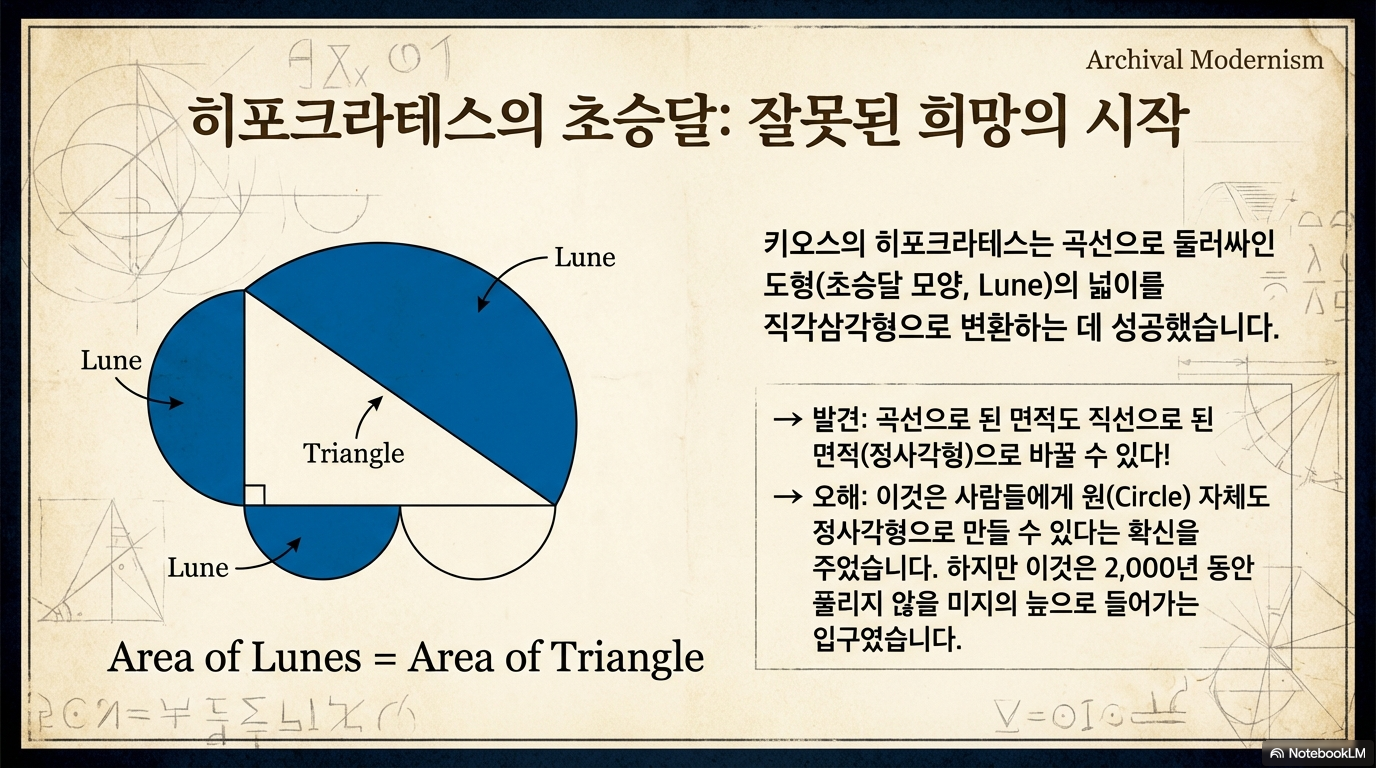 인류가 이 '원이라는 감옥'에 2,000년 동안이나 갇히게 된 결정적인 계기가 있었습니다. 바로 키오스의 히포크라테스가 발견한 '초승달 모양의 넓이' 증명입니다. 그는 피타고라스 정리를 응용하여, 두 개의 작은 반원의 넓이 합이 큰 반원의 넓이와 같다는 원리로부터 곡선으로 둘러싸인 '초승달'의 넓이가 직각삼각형의 넓이와 정확히 일치함을 증명해냈습니다.