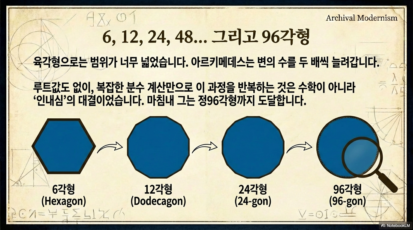 아르키메데스는 이 보이지 않는 벽을 넘기 위해 무한한 노동을 선택했습니다. 지름 1인 원에 내접·외접하는 육각형에서 시작해, 변의 개수를 12, 24, 48각형으로 계속해서 **배가(Doubling)**해 나갔습니다. 마침내 96각형에 이르렀을 때, 그는 원주율이 3.1408과 3.1428 사이에 있음을 밝혀냈습니다. 이는 단순한 계산을 넘어, '직선화할 수 없는 원주'라는 한계를 무한한 다각형의 변을 통해 극복하려 했던 인간 의지의 산물이었습니다.