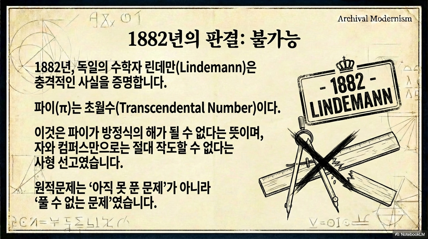 2,000년 넘게 이어진 이 거대한 도전은 1882년, 독일의 수학자 린데만에 의해 종지부를 찍게 되었습니다. 파이(π)가 어떤 방정식의 해로도 표현될 수 없는 '초월수'임이 증명되면서, 자와 컴퍼스만으로 원적 문제를 해결하는 것은 인간의 영역에서는 결코 도달할 수 없는 '불가능'임이 확정된 것입니다. 원은 끝내 사각형이라는 인간의 논리 안에 갇히기를 거부했습니다.