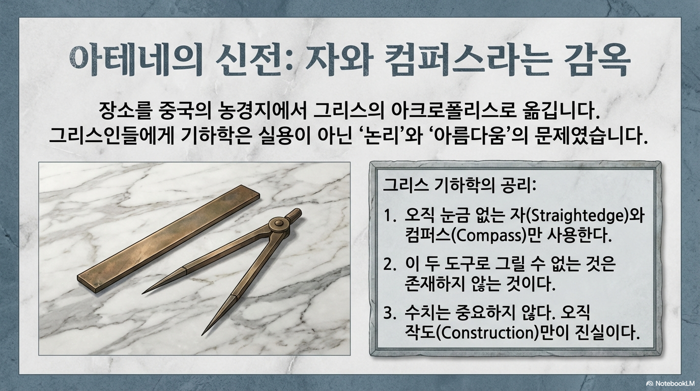 반면 고대 그리스인들은 원이라는 곡선을 사각형이라는 직선의 틀 안에 완전히 가두려 했습니다. 그들에게 기하학은 오직 '자와 컴퍼스'만을 허용하는 엄격한 논리의 세계였습니다. 두 점을 잇는 직선과 한 점을 중심으로 도는 원, 이 자명한 공리 위에 세워진 세계는 정밀했지만, 한편으로는 그 규칙을 벗어날 수 없는 거대한 '논리의 감옥'이기도 했습니다.