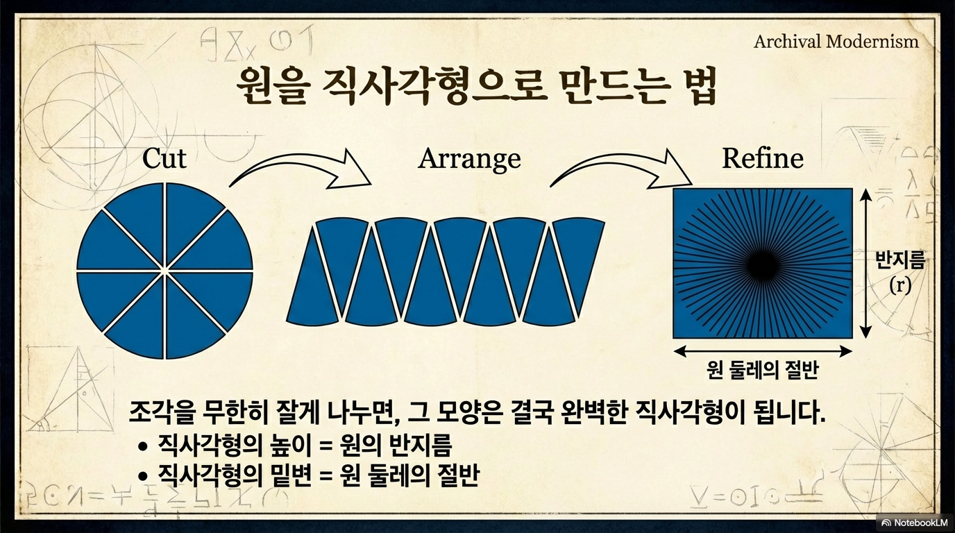 그리스 본토의 엄격한 교조주의에서 벗어나 있던 아르키메데스는 훨씬 혁신적인 방식으로 문제의 본질에 다가갔습니다. 그는 원을 잘게 쪼개어 이어 붙이면 결국 직사각형이 되고, 이를 다시 직각삼각형으로 변환할 수 있다는 사실을 간파했습니다. 그는 원의 넓이가 **'높이는 반지름이고 밑변은 원의 둘레(원주)인 직각삼각형'**의 넓이와 같다는 것을 깨달았습니다. 그러나 문제는 '굽어 있는 원주'를 어떻게 직선으로 펴서 측정하느냐는 것이었습니다.