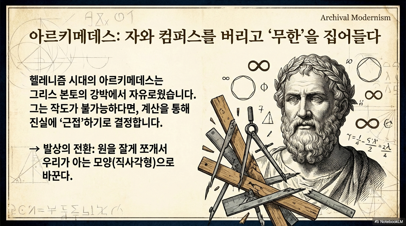 우리의 삶 속에도 때로는 답이 없는 줄 알면서도 매달려야 하는 문제들이 있습니다. 완벽한 원을 사각형으로 구현하려 했던 그들의 무모한 집념은 우리에게 묻습니다. 결과가 불가능으로 판명될지라도, 본질에 다가가기 위해 끝까지 걸어갔던 그 '노동의 시간' 자체가 이미 하나의 위대한 진리가 아니었느냐고 말입니다.