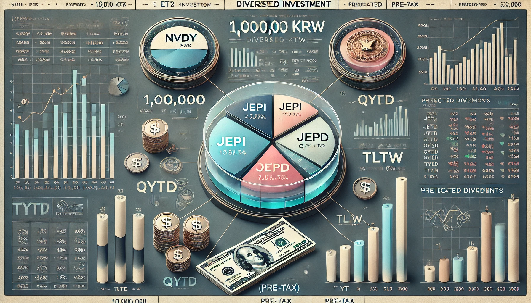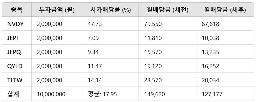 1,000만 원을 월배당 ETF에 분산 투자할 경우, 각 ETF의 시가배당률과 투자 비율을 활용하여 예상되는 월배당 수익을 계산할 수 있습니다. 아래는 NVDY, JEPI, JEPQ, QYLD, TLTW에 동일하게 20%씩 투자한 시나리오를 기준으로 한 상세 분석입니다.
