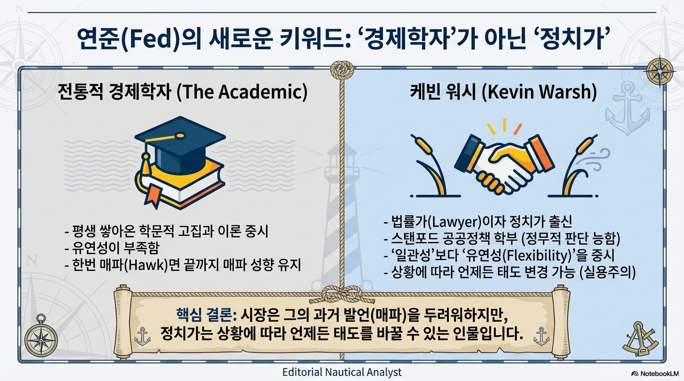 시장에서는 차기 연준 의장 후보인 케빈 워시(Kevin Warsh)의 과거 매파적 발언을 근거로 우려를 표합니다. 하지만 이는 그의 본질을 오독한 것입니다. 그는 학문적 고집에 매몰된 정통 경제학자가 아니라, 상황에 따라 유연하게 움직이는 법률가이자 **'공공정책 전공의 정치가'**입니다.