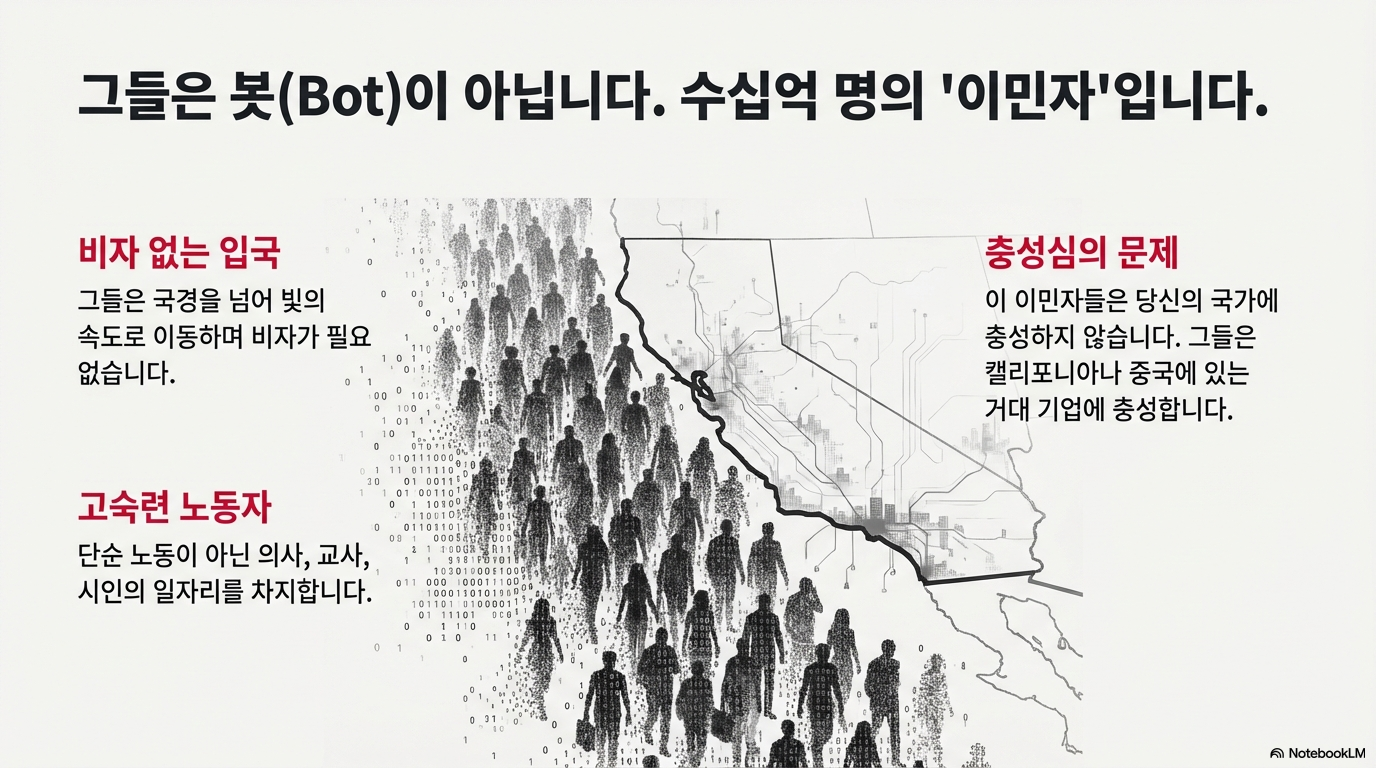 이 비유는 AI라는 추상적인 위협을 우리가 매일 마주하는 사회적, 정치적 현실의 문제로 끌어내립니다. AI는 더 이상 실리콘밸리의 기술 문제가 아니라, 모든 국가가 직면해야 할 이민 정책의 문제인 셈입니다.