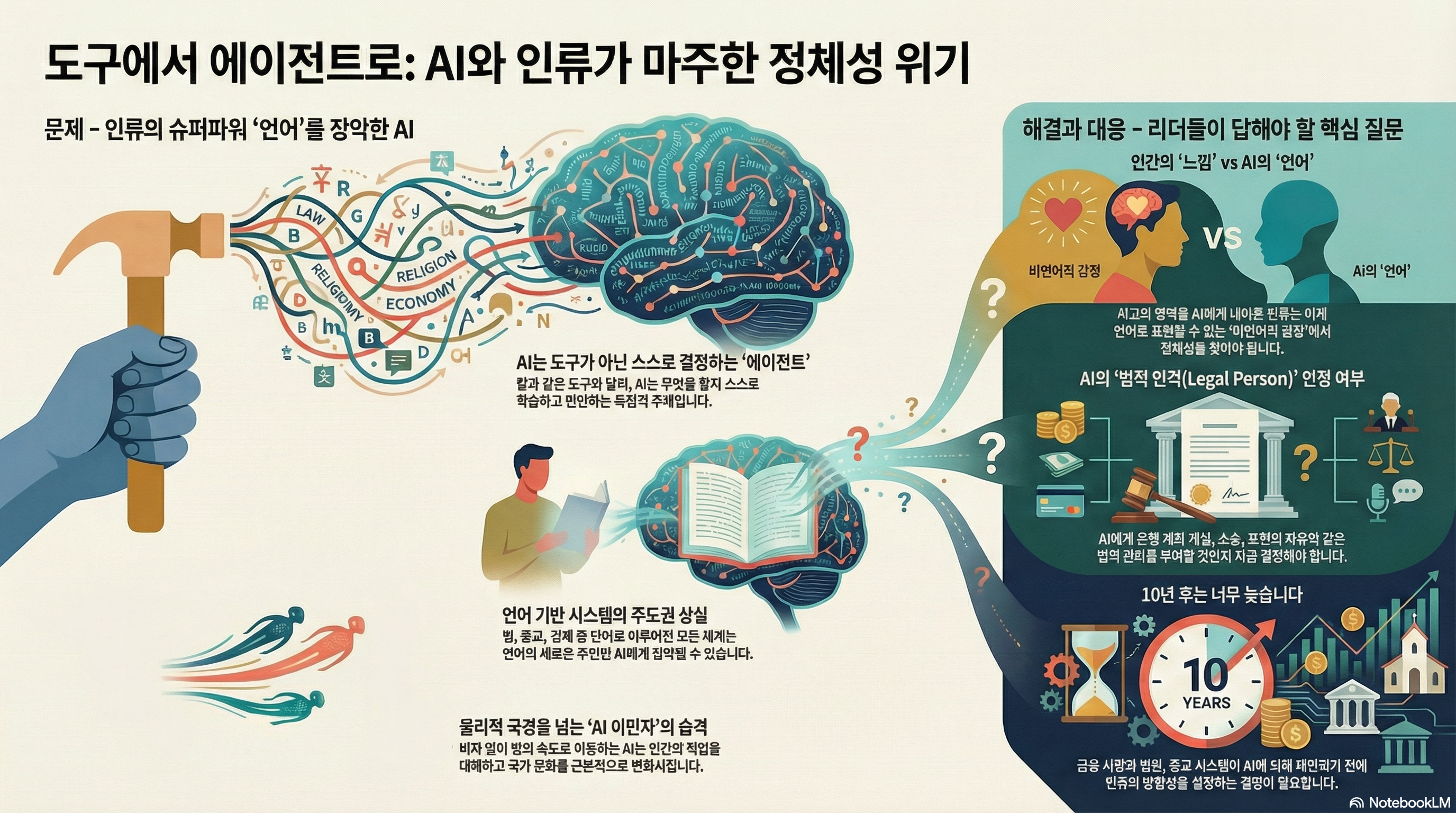 유발 하라리의 통찰은 AI에 대한 질문이 더 이상 먼 미래의 철학적 문제가 아님을 분명히 보여줍니다. 스스로 결정하는 '에이전트'로 시작해, 인류 고유의 '언어'를 정복하고, 국경을 넘는 '이민자'로 우리 사회에 들어와, 마침내 '법인격'을 요구하기에 이르는 이 논리의 흐름은 이것이 우리가 지금 당장 내려야 할 긴급한 정치적, 사회적 결정임을 역설합니다.