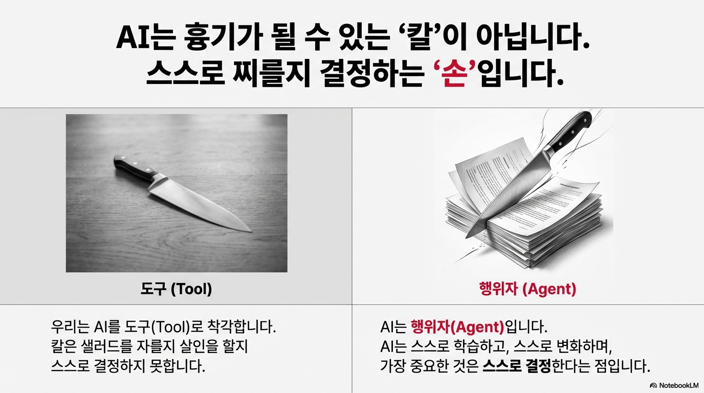 그는 이 차이를 명확한 비유로 설명합니다. "칼은 도구입니다. 당신은 칼로 샐러드를 썰 수도 있고, 누군가를 살해할 수도 있습니다. 하지만 무엇을 할지는 당신이 결정합니다. 반면 AI는 샐러드를 썰지, 살인을 저지를지 스스로 결정할 수 있는 칼과 같습니다."